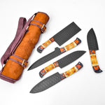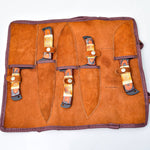 4.5" chef's knife, 6.5'' Chef's knife, 8" chef's knife, 9" chef's knife, 6.5" vegetable cleaver, leather roll bag