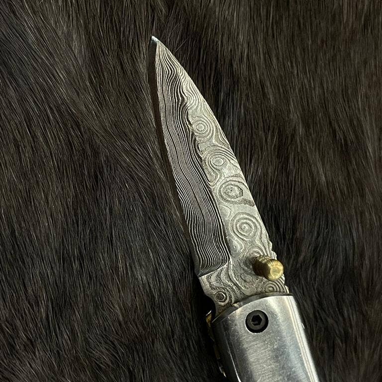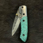 Turquoise (Resin) handle pocket knife, Damascus steel3" blade. Perfect EDC carry with a beautiful file work on the spin &  locking mechanism.  Comes with hand-stitched leather sheath.