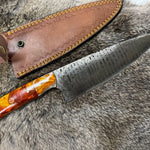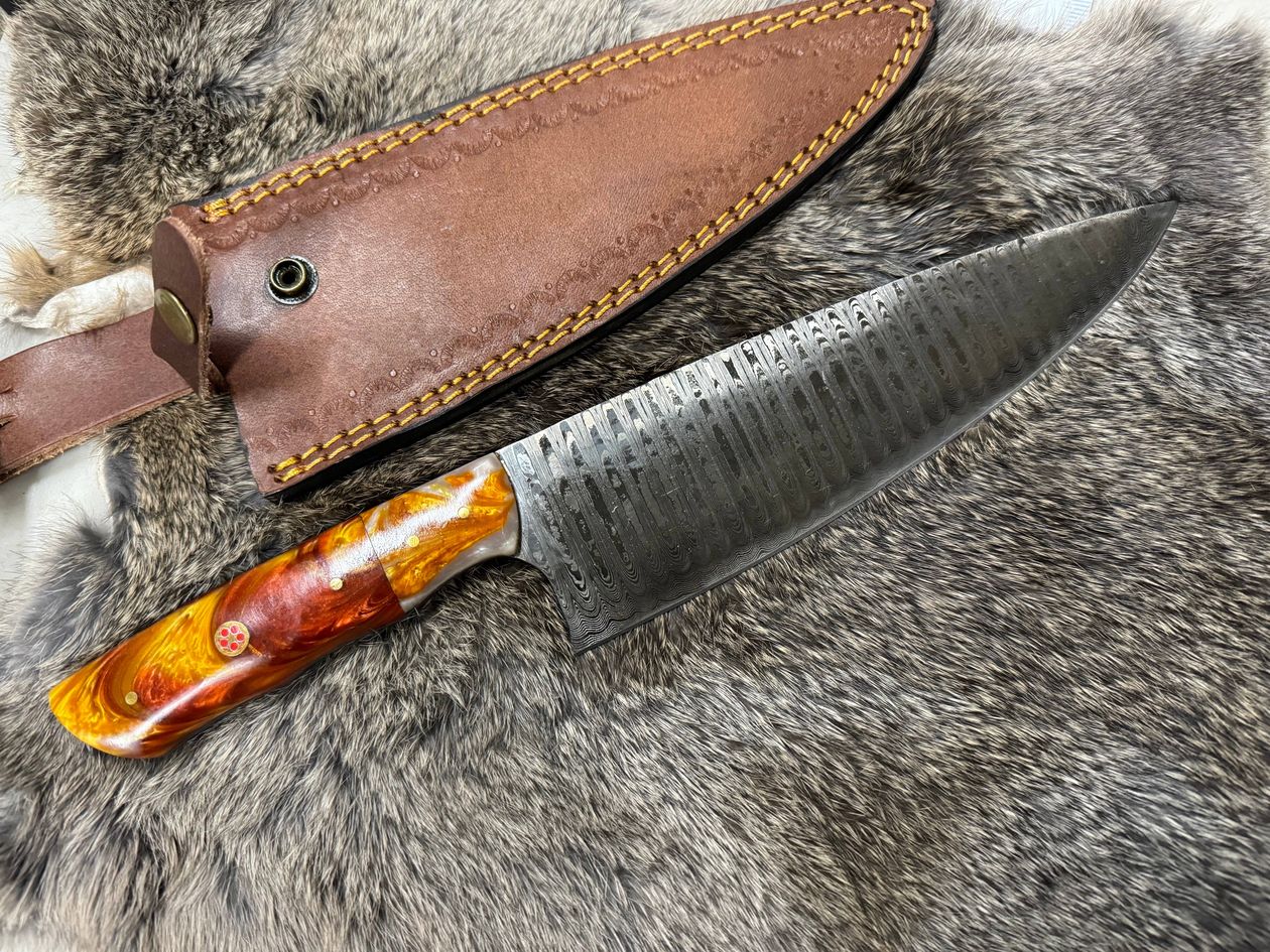 This perfectly balanced chef knife is designed for precision, control, and everyday performance in the kitchen. Crafted from hand-forged Damascus steel, the blade delivers exceptional sharpness, edge retention, and striking layered patterns. Paired with a custom resin handle, it offers a comfortable grip and smooth balance for effortless cutting.