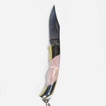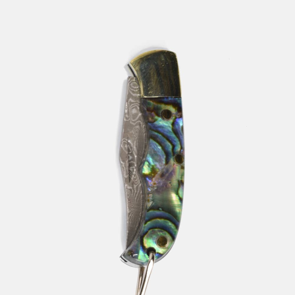 Curated Basics presents the Small Ox-horn, Abalone and/or Green Resin Inlay Folding Knife, along iwth the Mini Antler and Pink Shell knives. These compact yet robust pocket knives features a remarkable Damascus steel blade. The Mini Knives are 1.25 inches folded, and the Small Abalone and Oxbone are 1.75 inches folded. Both minis and smalls are the perfect balance of size and functionality. More than a mere tool--it is an accessory, and you can even wear it as jewelry! Designed to take anywhere, it adds a touch of sophistication to your everyday essentials. Perfect as a gift for bridal parties or any occasion.