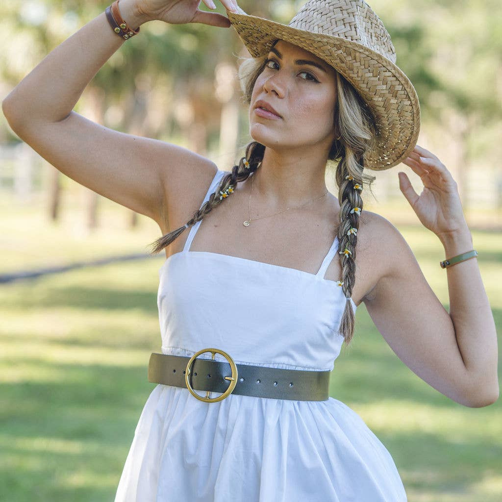 This wide genuine leather belt paired with a brass round circle buckle is a classic wardrobe staple. This round buckle leather belt is simple yet chic and perfect to accentuates casual, vintage or boho styles. Style this belt with coir favorite denim, belt a flowy dress, or use it to bring together a skirt and top.