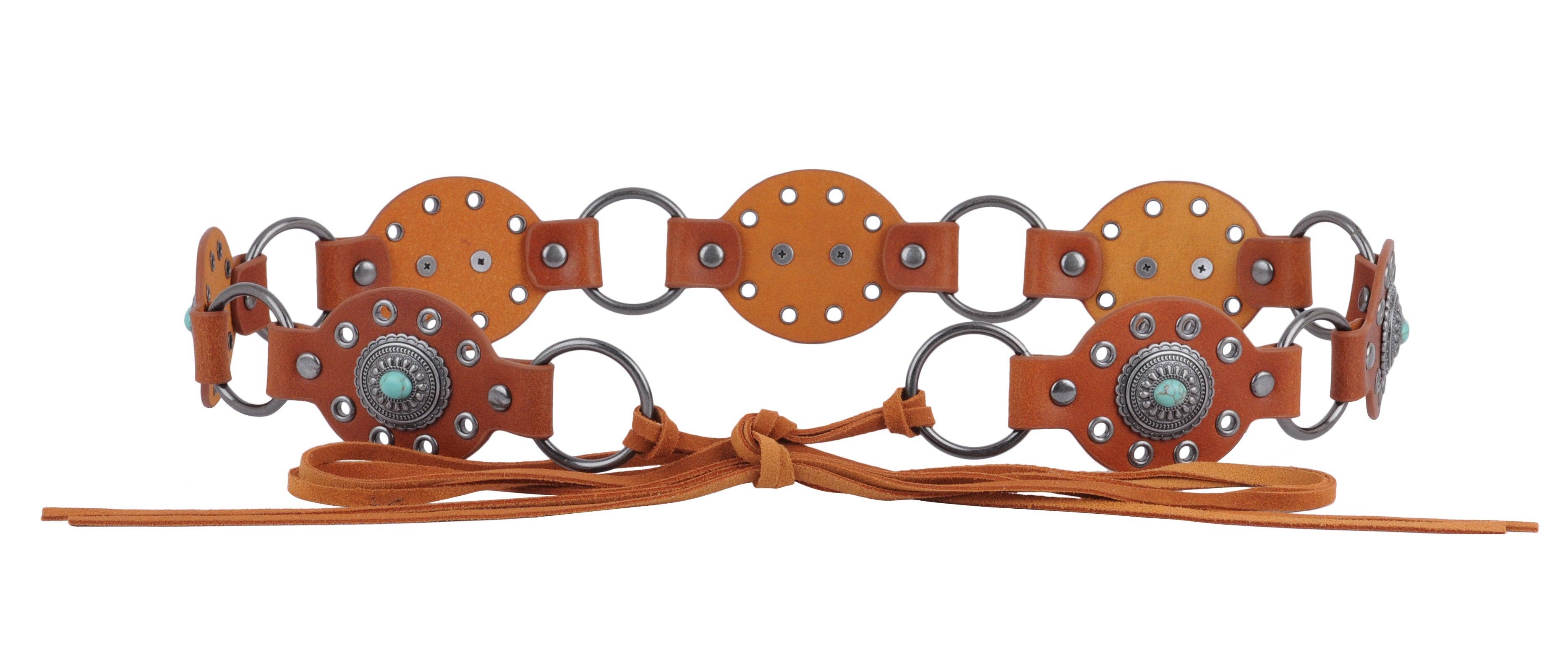 Discover the perfect blend of Western charm and bohemian elegance with our Genuine Leather Concho Belt featuring a captivating turquoise accent stone. Crafted with precision and attention to detail, this belt adds a touch of timeless sophistication to any outfit. Width: 2.25" Length: SM - 66.5" (US sizes 0-10) ML - 70.5" (US sizes 11-16) How to style: over a summer dress or jumpsuit!