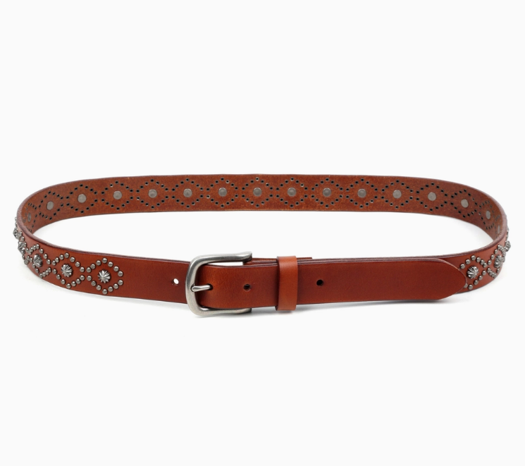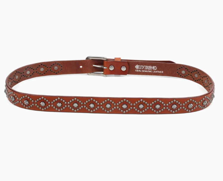 A bright shining accessory to amp up any outfit, the sunburst leather belt is designed to accent with its handcrafted look and sparkling full-length sunburst pattern. This belt gives old west meets new-age, and can be added to a fur vest and flowing dress or worn with flares and boots.