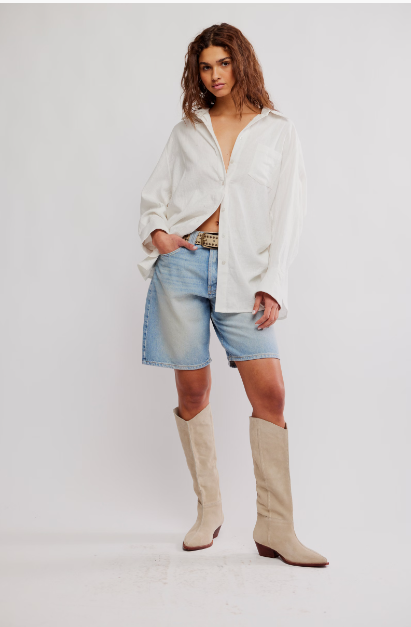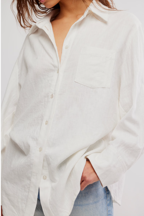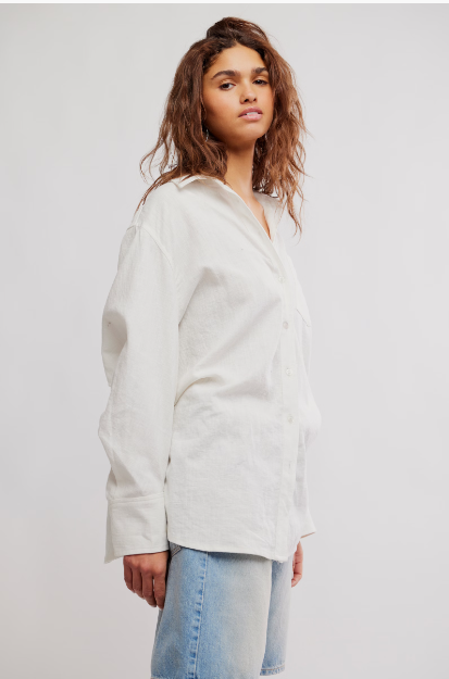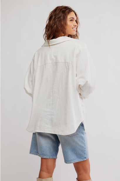 A twist on the traditional, relaxed cotton in the softest parchment color and an unusual oversized button-down shape, the Sabine is a wardrobe workhorse. Layer it under sweaters and dresses to add some prep to your step, or go business casual with a half-tuck and slacks or denim. Darting in the front and back pleats add some shape to the otherwise voluminous shape.