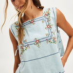 A beautiful sky blue top, in a swing-y summer shape featured so-sweet floral embroidery and a scalloped edge.