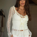 Ravenlee Sheer Floral Lace Ruffle Self Tie Long Sleeve Top- Cream
