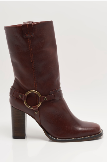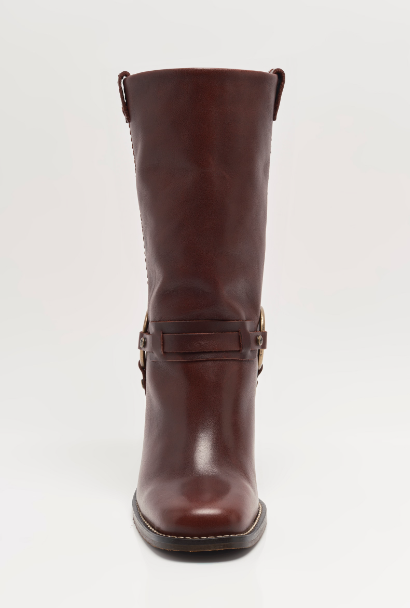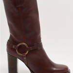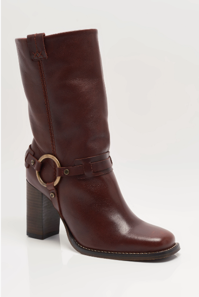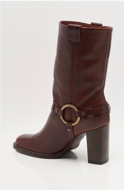 Add some edge to your 'fit in this classic mid-calf boot by Free People. Gorgeous wine-toned leather and harness-style detailing with a silver ring nod to classic motorcycle style, updated with a beautiful tall stack heel. Wear them with everything in your wardrobe, from flowy lace skirts to micro mini shorts.