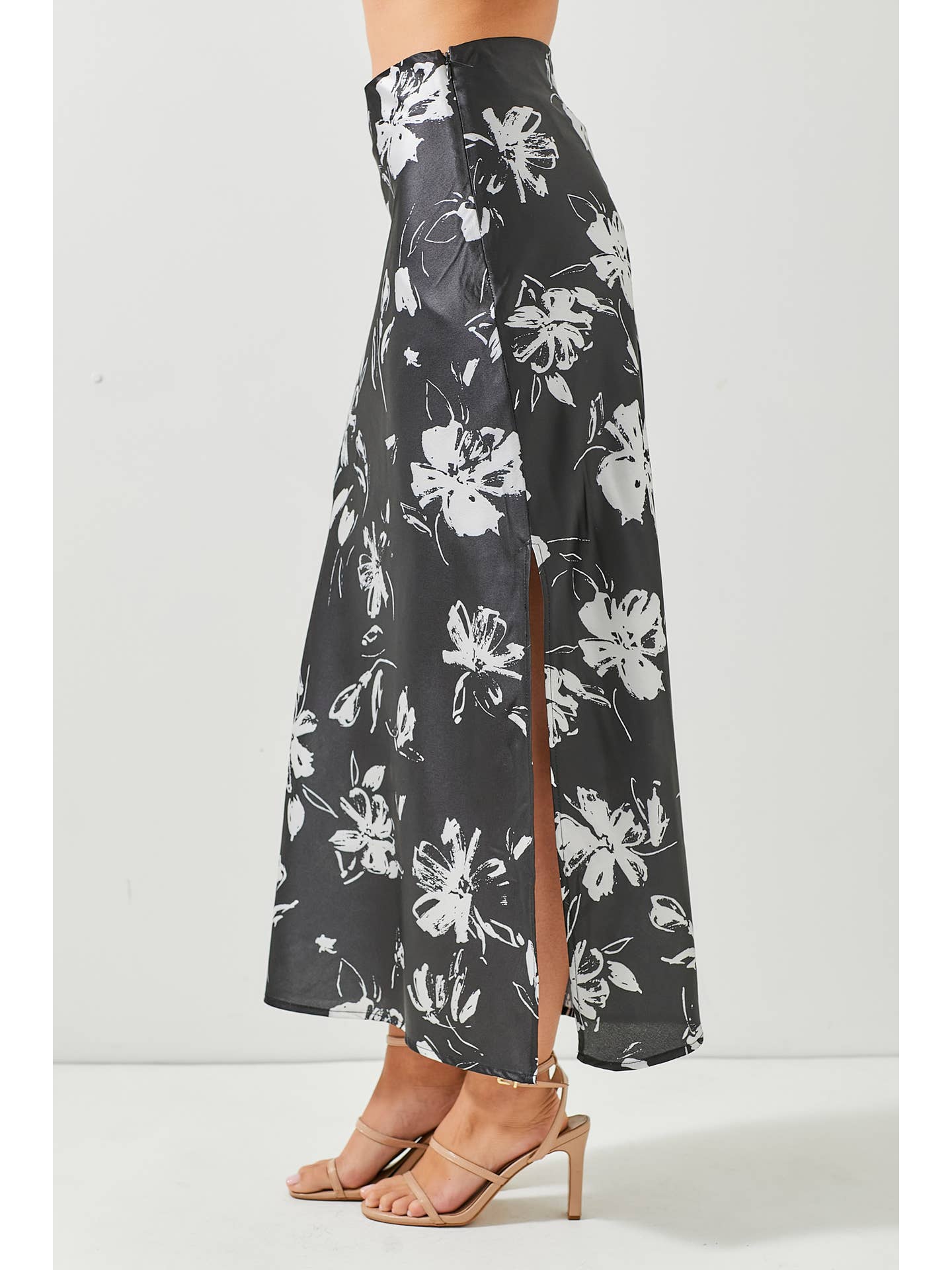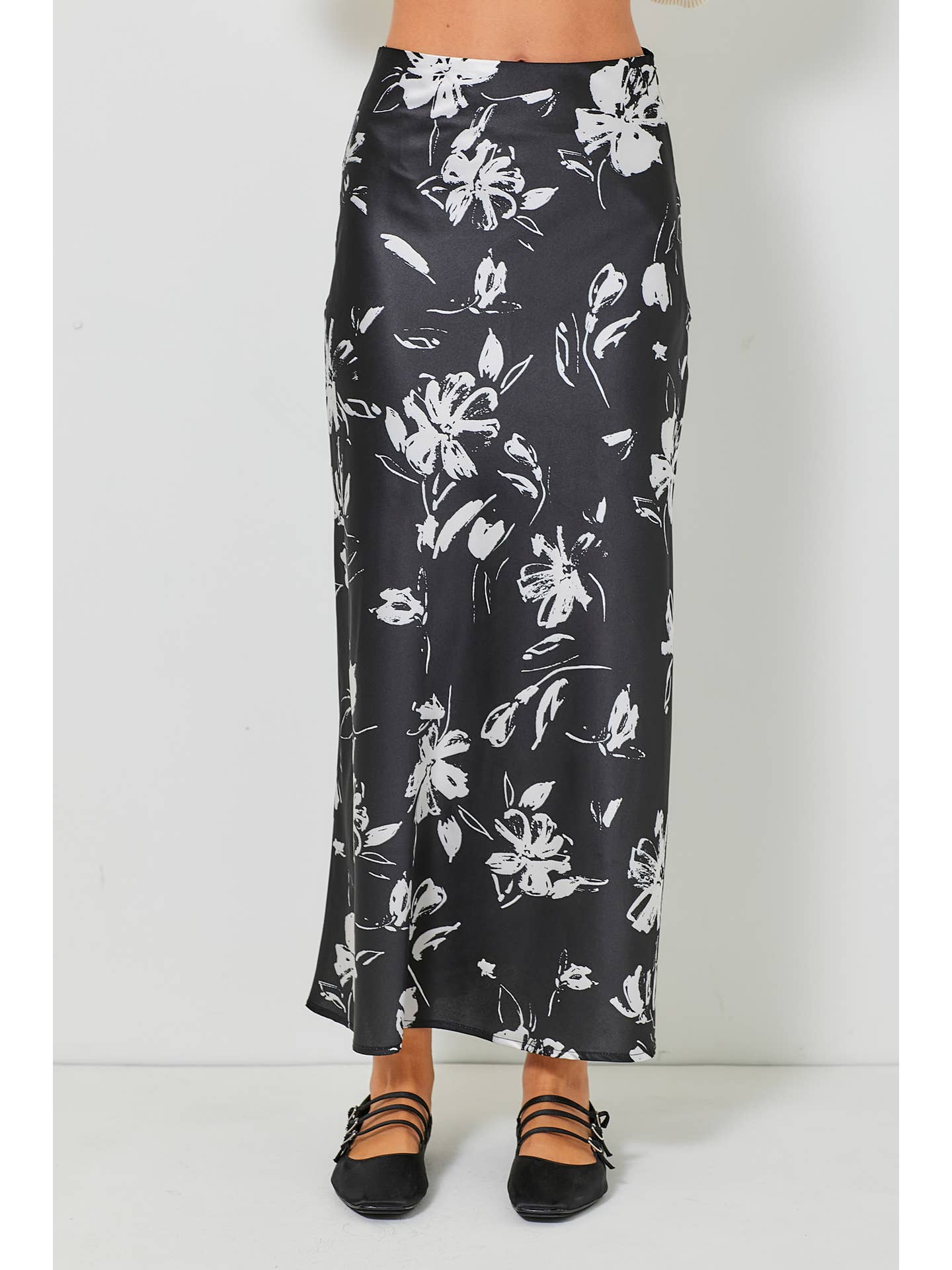 Floral Satin Maxi Skirt - Black