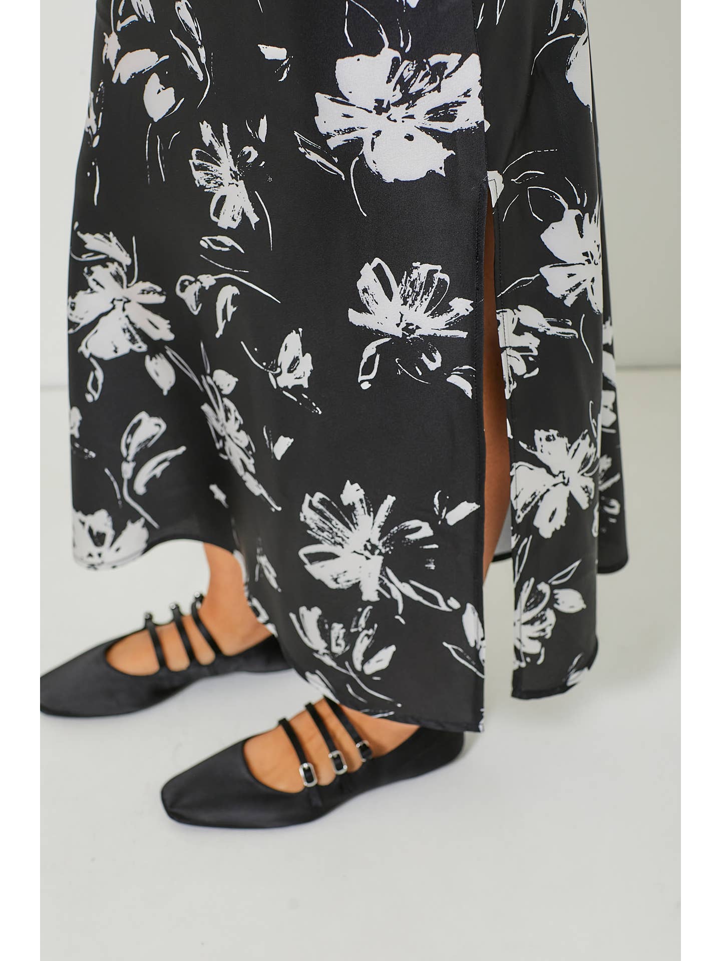 A lovely floral print in classic black and white, this piece extends your wardrobe in all kinds of new ways. Great for travel and capsule collections, it rolls up easily and pairs well with everything! Side slit and side zipper entry.