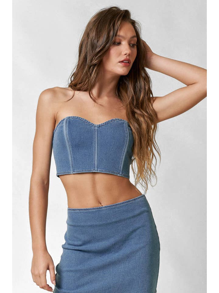 Channel structured sophistication with this denim corset top, featuring a romantic sweetheart neckline and a form-fitting silhouette. Designed with structured boning and a secure back zip closure, it offers both style and support for a confident, head-turning look.