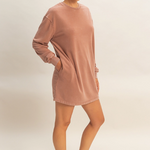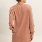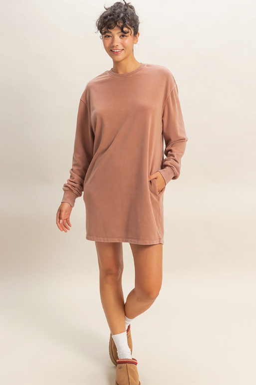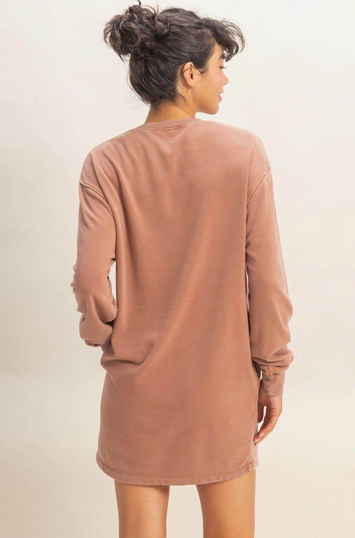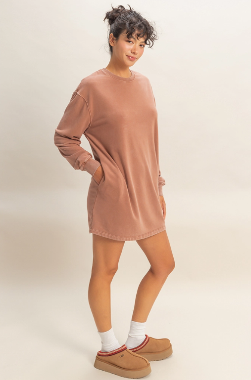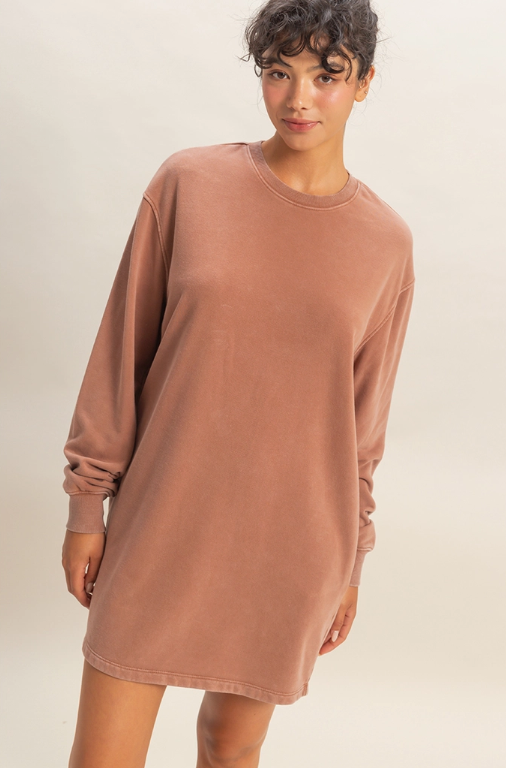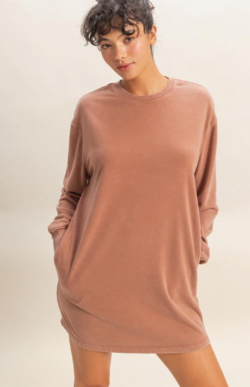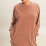 Super soft mineral wash in the easiest silhouette, you'll never want to take off this oversized shirt dress.  A crew neck, long sleeves, and an oversized shape this a casual dress you can lounge in and dress up.  A tall pair of boots and knee socks complete the look.