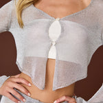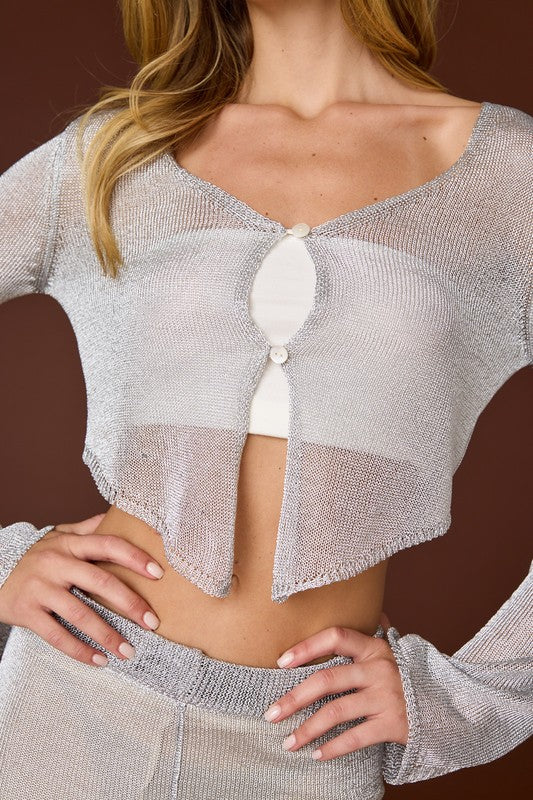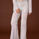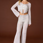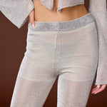 Feeling groovy? This set will have you sparkling with every step whether you are at a bachelorette bash or visit to Vegas! Made of open weave metallic mesh knit, the silvery cardigan top and matching flared pants will have everyone's heads turning.