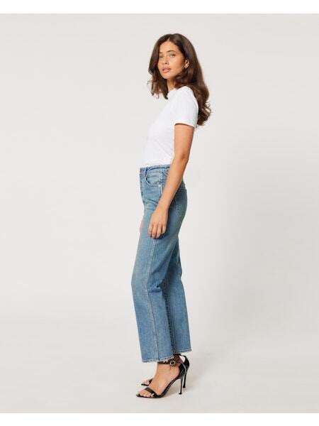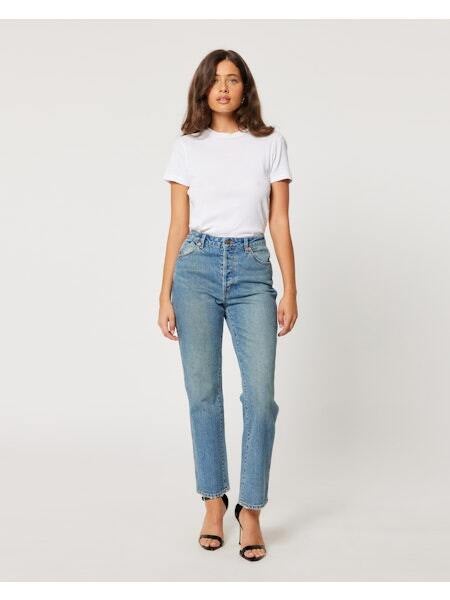 High Rise Broken in Straight Jeans from Rollas in Mid Vintage Blue Wash. Perfect pockets and mostly cotton (1% elastic) for an incredible fit.