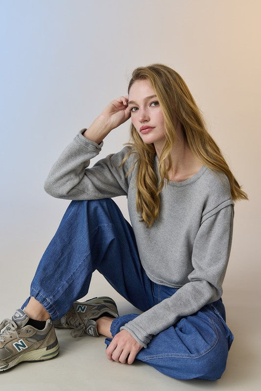 This round neck easy cropped sweater is perfect for slouching at home or running errands on your day about town. Cute and cropped, with seam detail at cuff and hem, and overlay at drop shoulder seam.