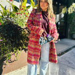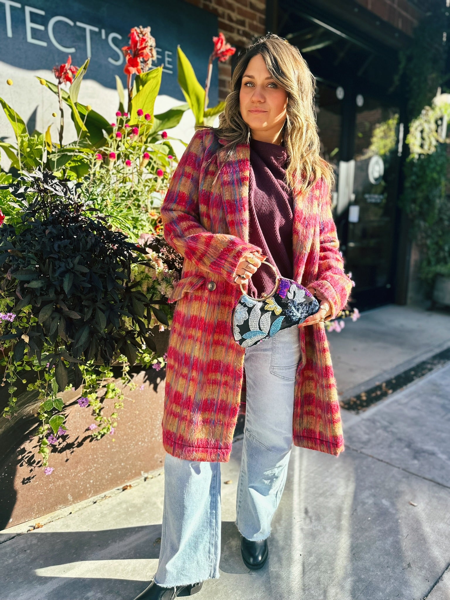 Make a statement in this head-turning fall coat. Double breasted with lapel collar, front flap pockets and long sleeves join all in a soft fuzzy firebird plaid.