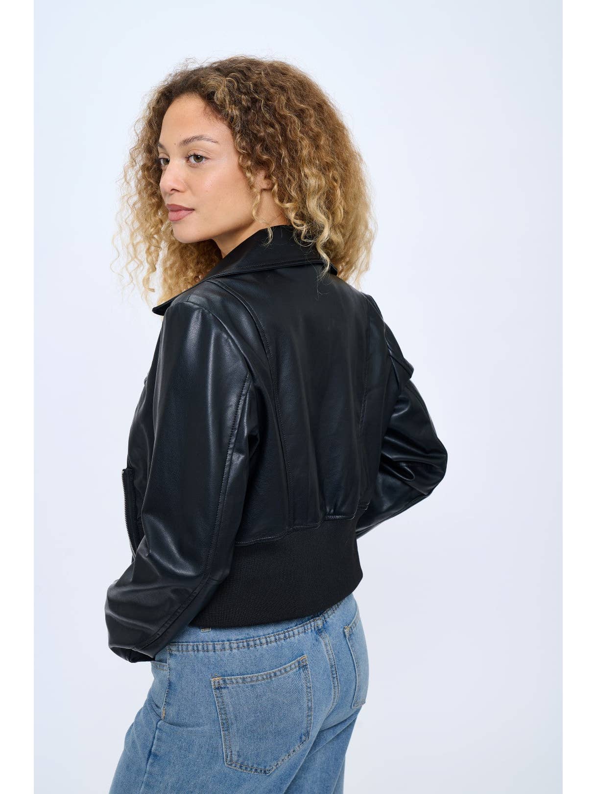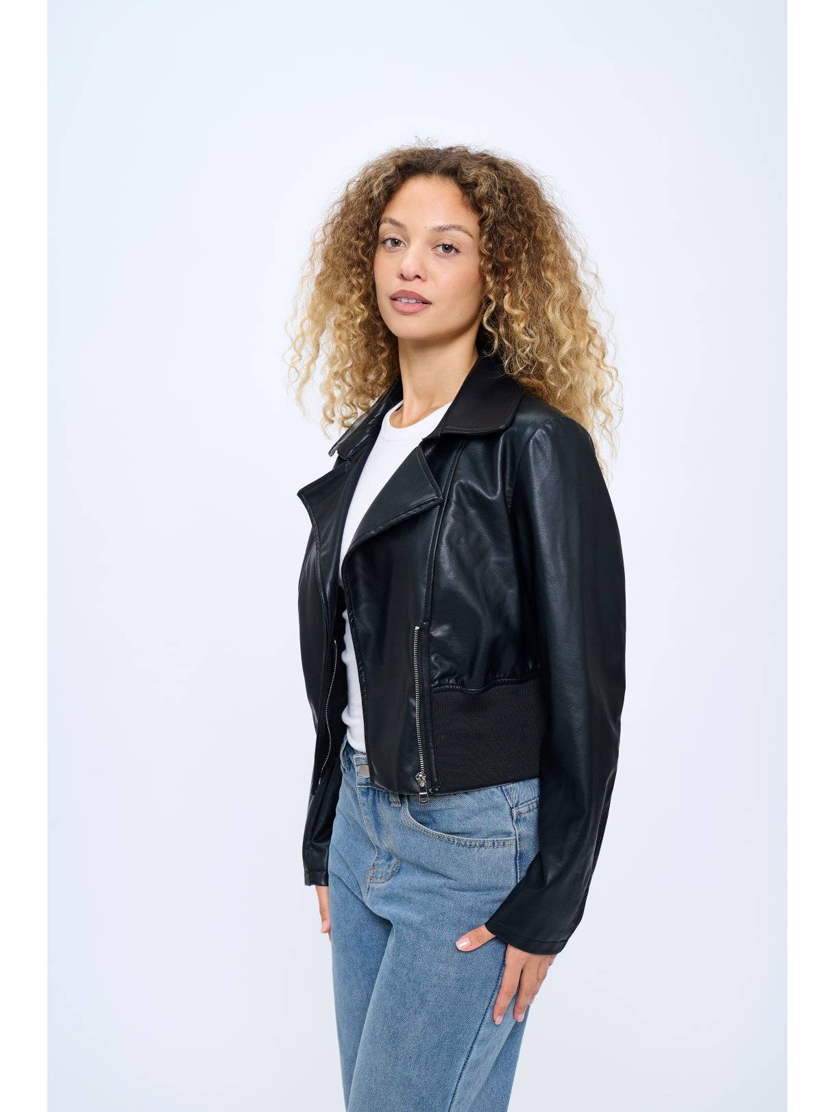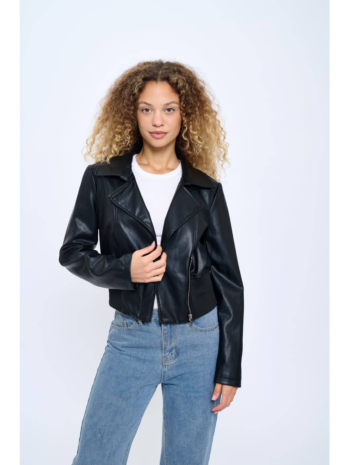 Women's Cropped Vegan Leather Jacket with Ribbed Waist Panel This contemporary vegan leather jacket features a refreshing sky blue color that adds a vibrant twist to the classic moto silhouette. The cropped design hits perfectly at the waistline, accentuated by a ribbed waist panel that creates a flattering, feminine fit. Wide notched lapels and clean lines maintain the jacket's modern aesthetic, while the soft vegan leather construction offers both ethical appeal and comfortable wear. The lightweight yet structured design makes it an ideal transitional piece for multiple seasons. Perfect for pairing with high-waisted jeans as shown, this statement piece elevates any casual outfit with effortless style. Available in 3 colors to suit diverse personal styles and wardrobes. Fabric Contents: 100% Vegan Leather