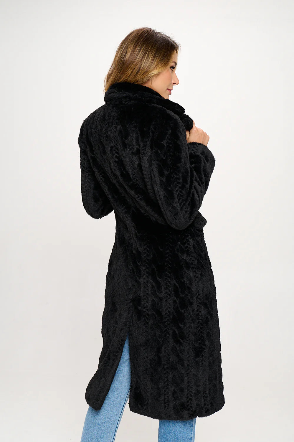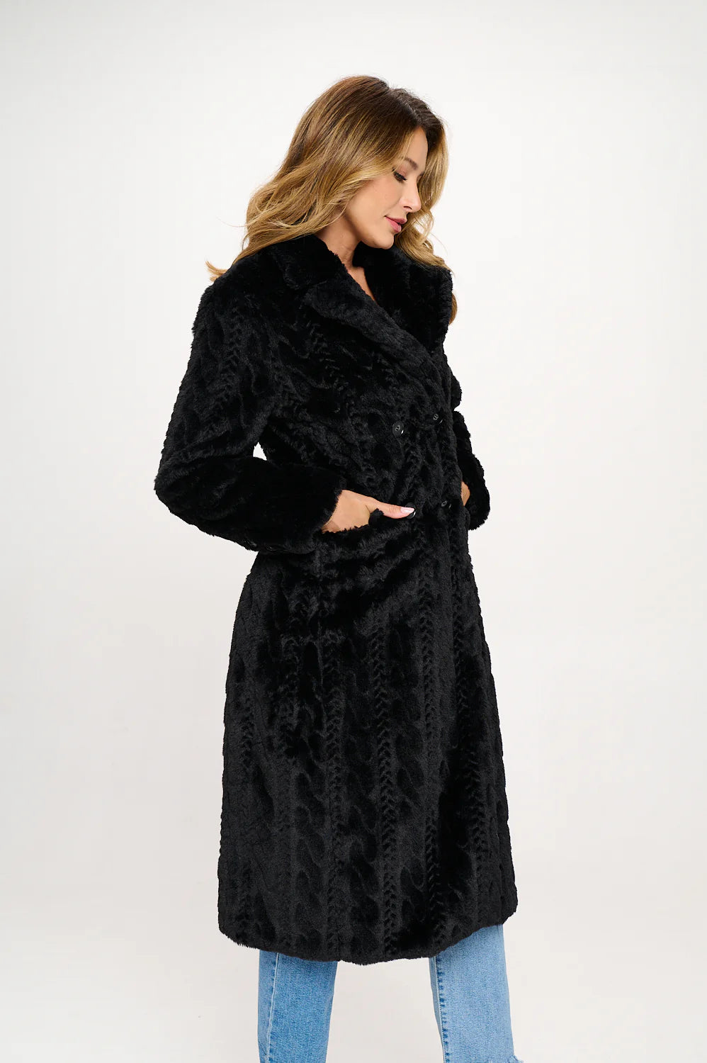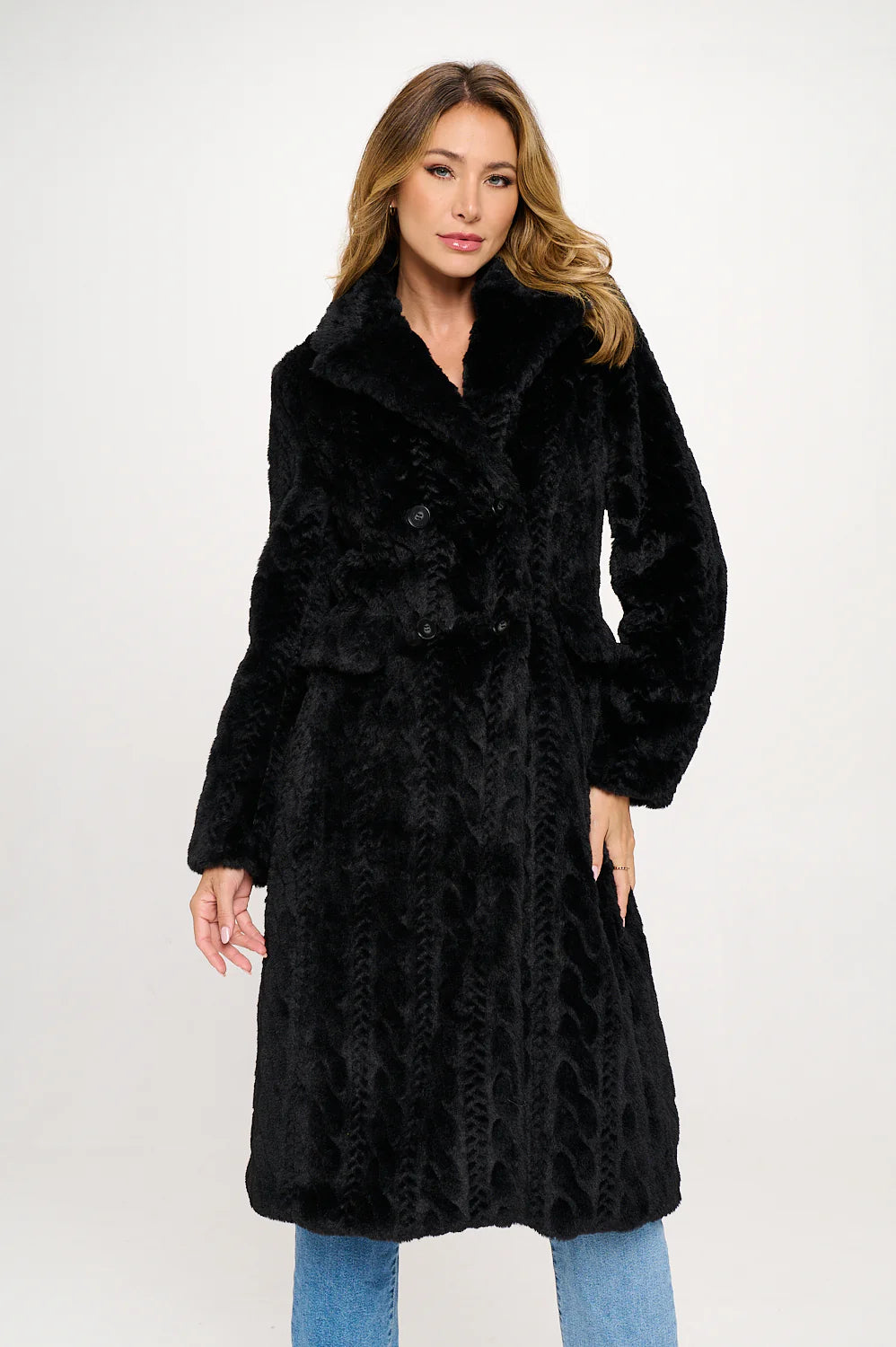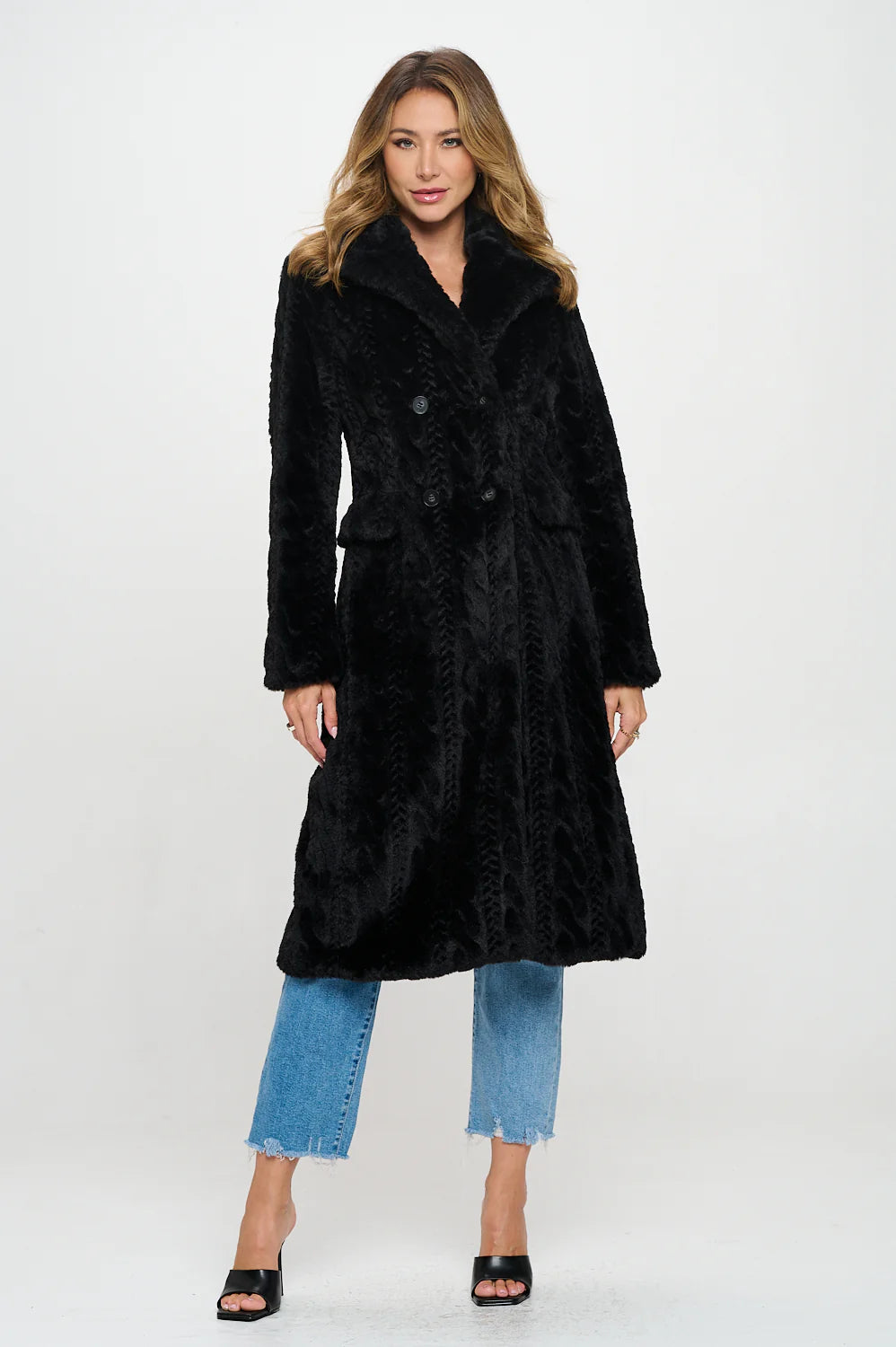 Timeless elegance meets modern tailoring in this fitted, full-length coat made out of the softest faux-fur Wear this double-breasted notched lapel coat downtown après ski for a touch of Montana style, or add warmth and a touch of extra by layering over a dress for holiday party or event.