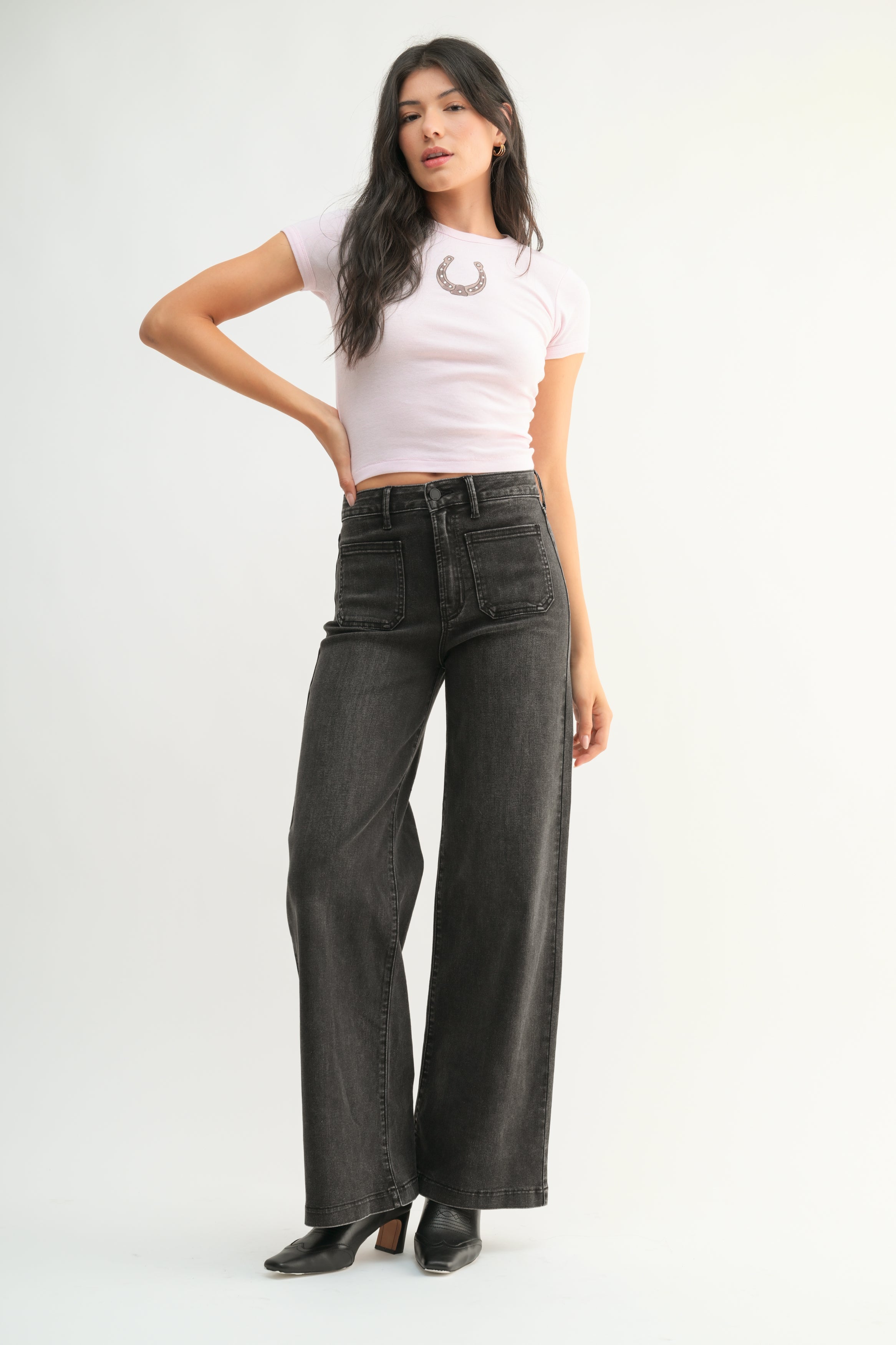 Patch pockets, plenty of stretch, and a wide leg that fits over your boots. These high rise jeans in dark chocolate brown are the perfect staple piece to pair with fall sweaters!