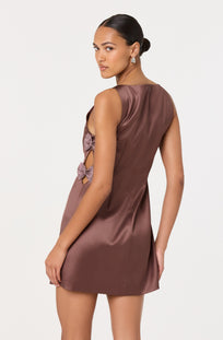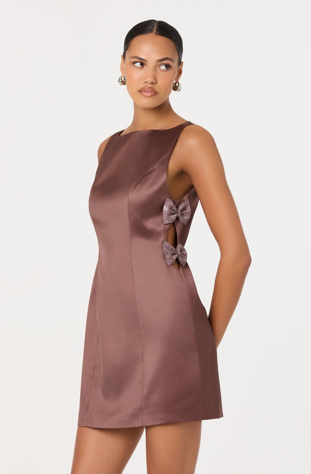 Decadent and shimmering, with a graceful boat neck, fitted bodice, and so-sweet rhinestone bow details along the open sides, this dress with have you fete ready. Wear it to any occasion that demands a little extra sparkle. The mini length feels fresh, and the high neck and back make it easy to wear.