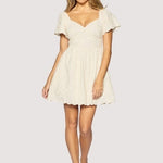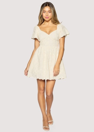 Short and sweet, with wide sleeve and a graceful structured bodice, this mini falls to a lovely length with scalloped details at the sleeve and hem.  Perfect for the graduate, the rodeo, or just any day in the summer!