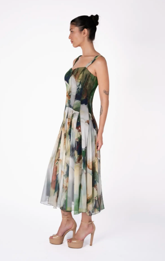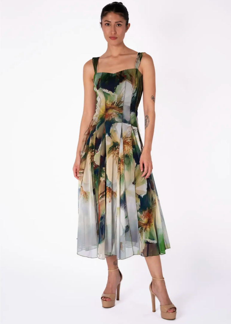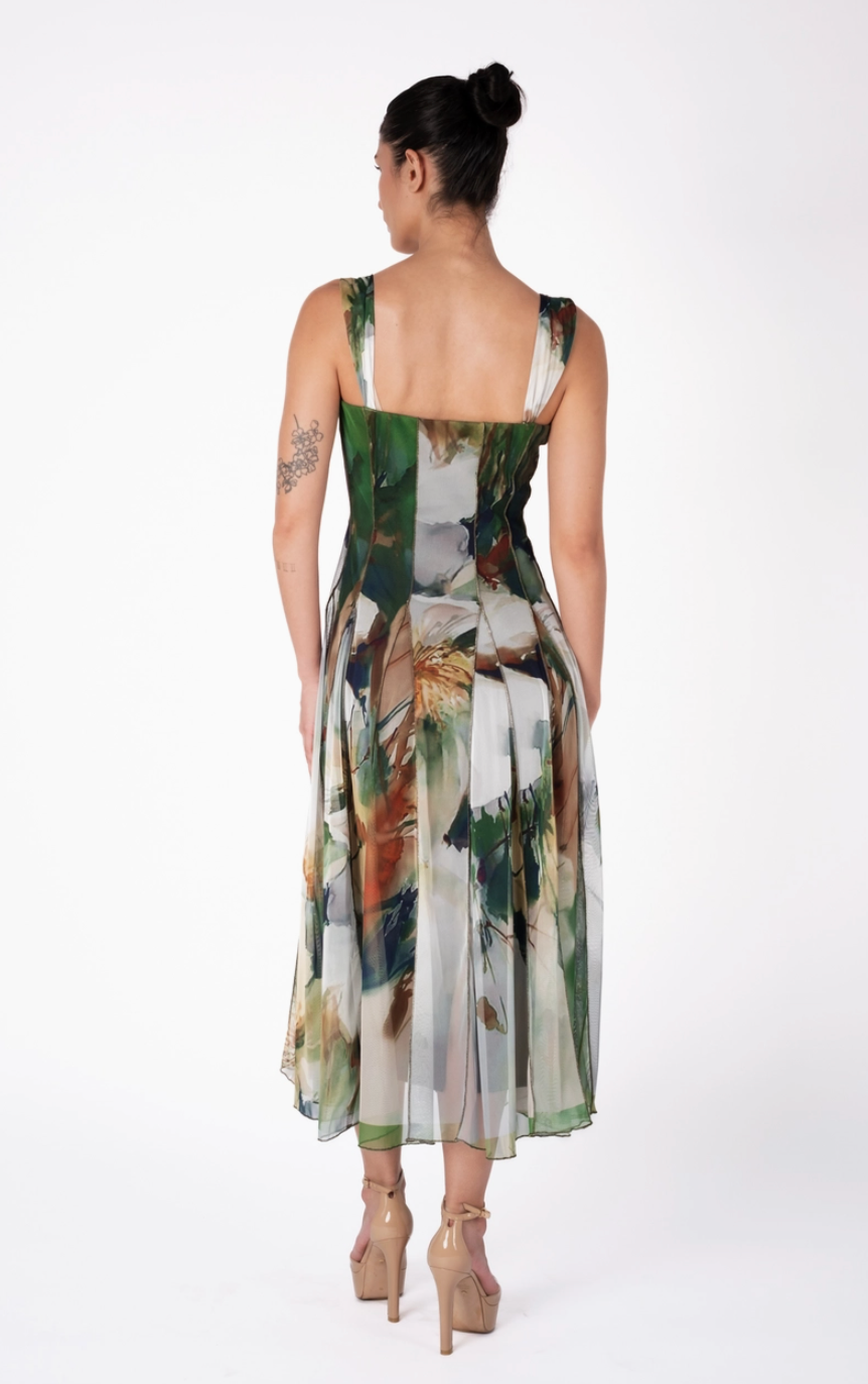 Take a spin in this supper flattering dress - gorgeous lines and incredibly comfortable. This paneled, fit and flare mesh dress has a fresh, multilcolor floral design and sweetheart neckline Midi-Length.