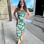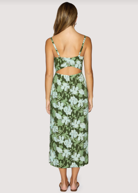 Whimsy and wonder combine in this effortless dress, with its fantastic floral pattern in hues of blues and greens creating a verdant background, all allowing the standout shape to shine. The wide square neckline and princess seaming of the bust keep the lines smooth in the front, and an open back and leg slit allow for airiness and movement. Perfect for any dressy occasion, or just a day that demands a dress. This unfussy piece can be worn with a Birkenstock or a heel, or can easily be paired with a cowgirl boot + turquoise for a western look.