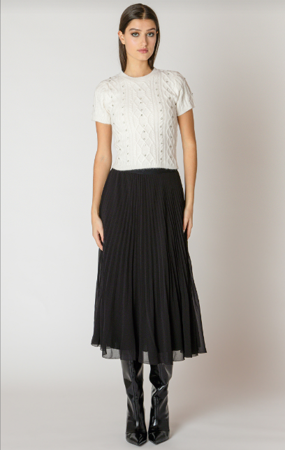 Pleats, Please! This skirt is a wardrobe problem solver: pair it with any top or sweater for instant easy elegance. Wear it dressed up with a body suit and heels for festive occasions, or take it casual with a low chunky boot, tights, and an oversized sweater.