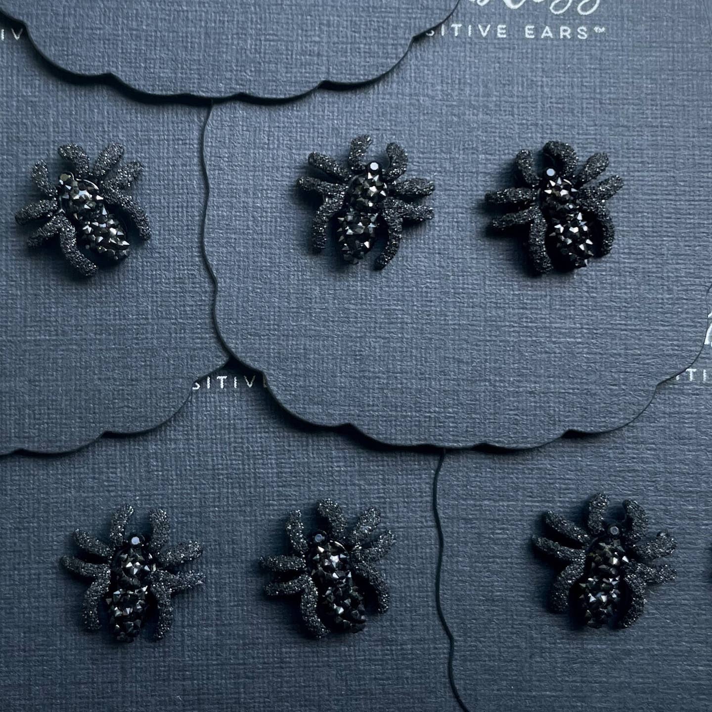 Stud earrings featuring .25 inch black spiders with sparkle bodies -- perfect for Halloween! Hypoallergenic surgical stainless steel posts. Made in USA