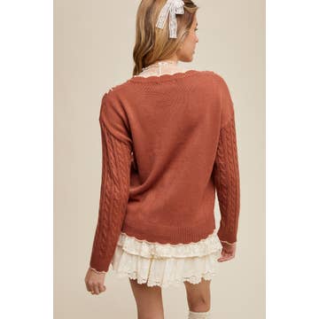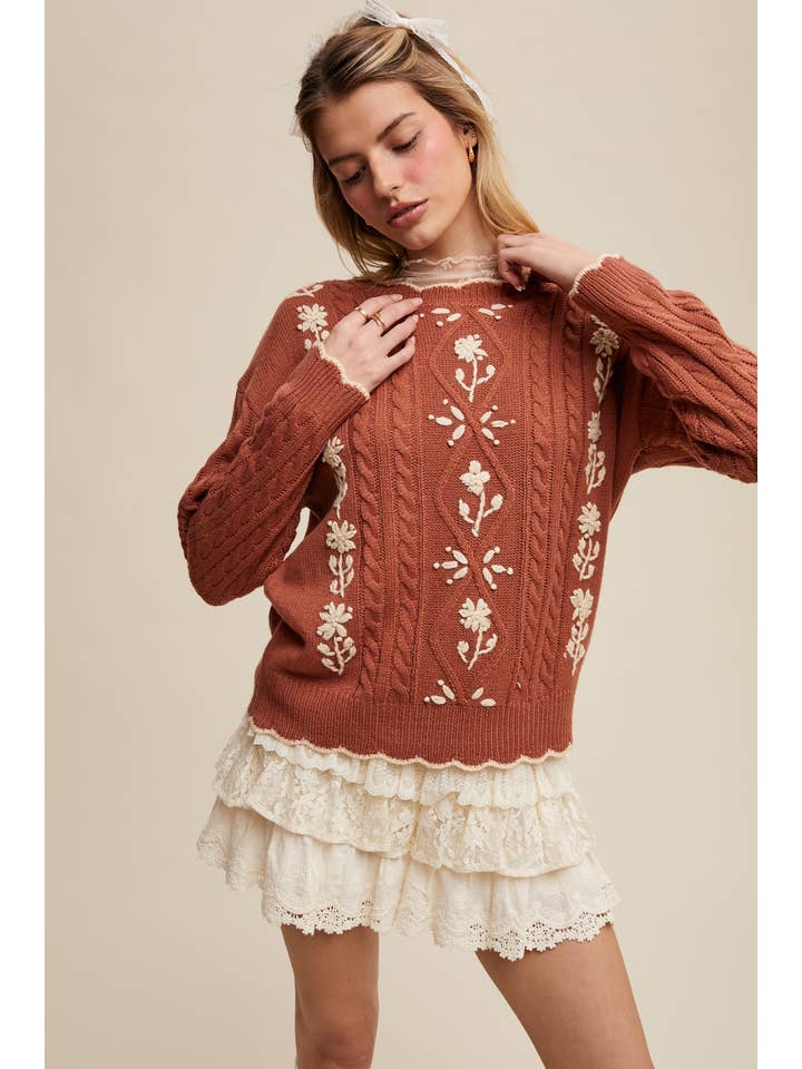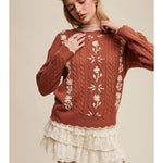 Floral Embroidered Cable Knit Sweater - Terracotta
