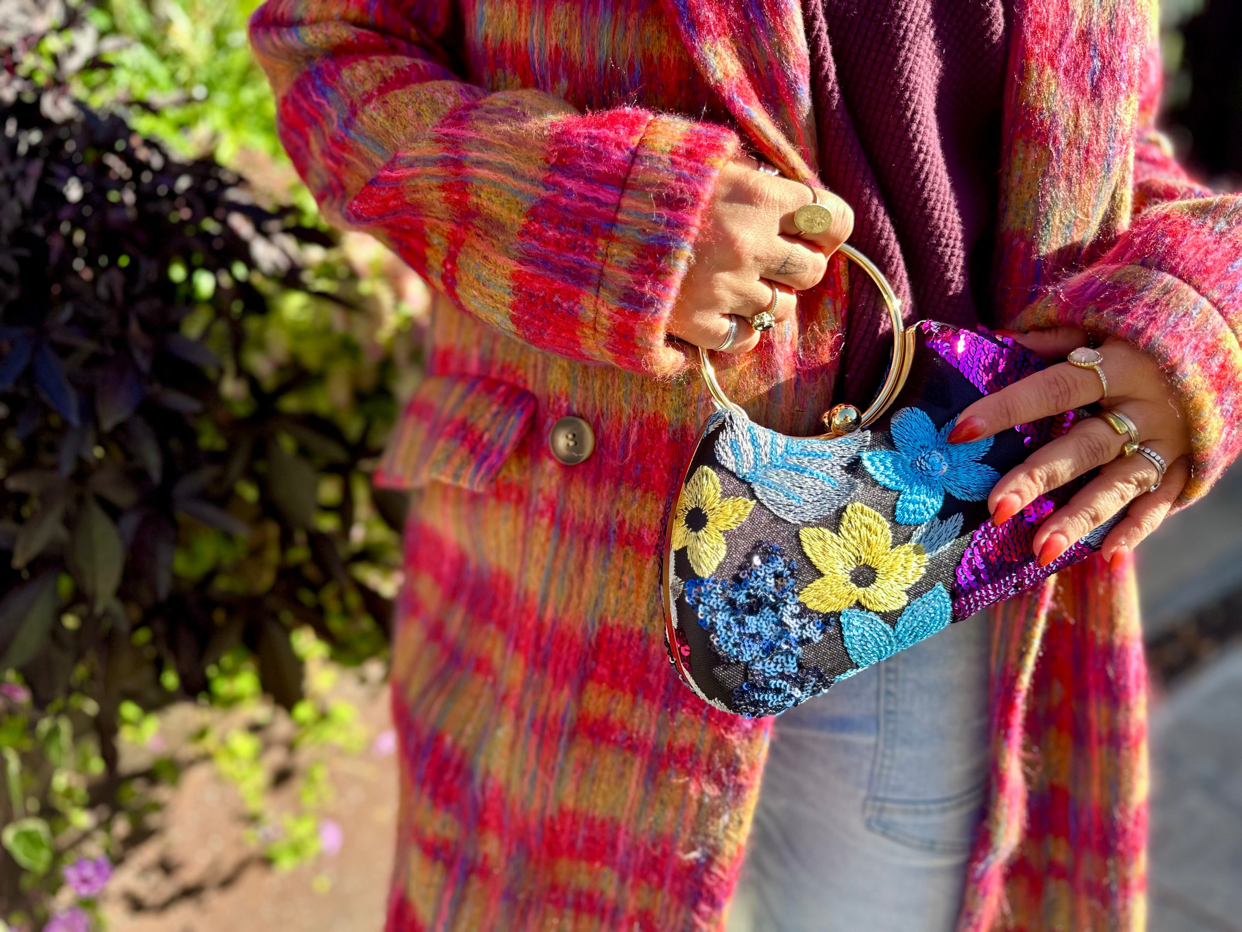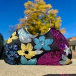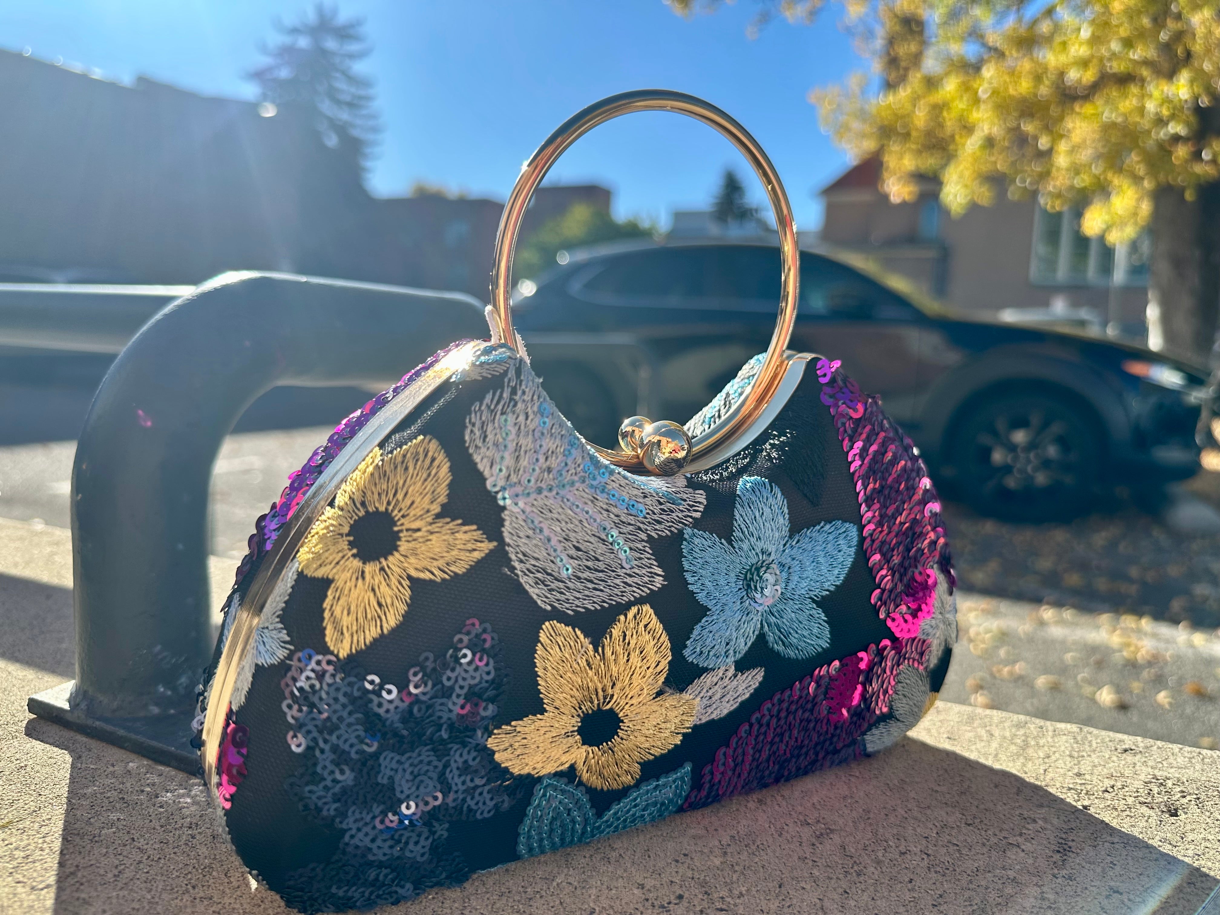 The eye-catching Phoebe bag features intricate sequined floral patterns, providing a perfect blend of elegance and fun. Its unique circular handle and detachable chain strap offer versatile styling options, whether you're dressing up for dinner or enjoying a night out.