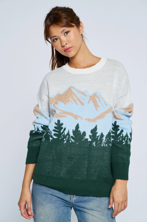 Cozy and stylish, this sweater featuring an allover mountain scene will have people asking where you got it. And the answer of course: Bozeman, Montana! Wear the wonder in this beautiful oh-so-soft retro-inspired knit. Full length sleeves and a crew neck will keep you cozy apres ski, or you can wear it everyday with denim and boots for some cabin cool.