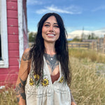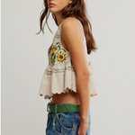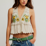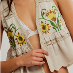 Bohemian perfection, this embroidered floral top will add a romantic touch to everyday denim, or layer perfectly over long sleeves when the weather turns. Soft earthy colors, and a beautiful trapeze shape accented with panels of crocheted lace make this piece a head-turner.