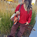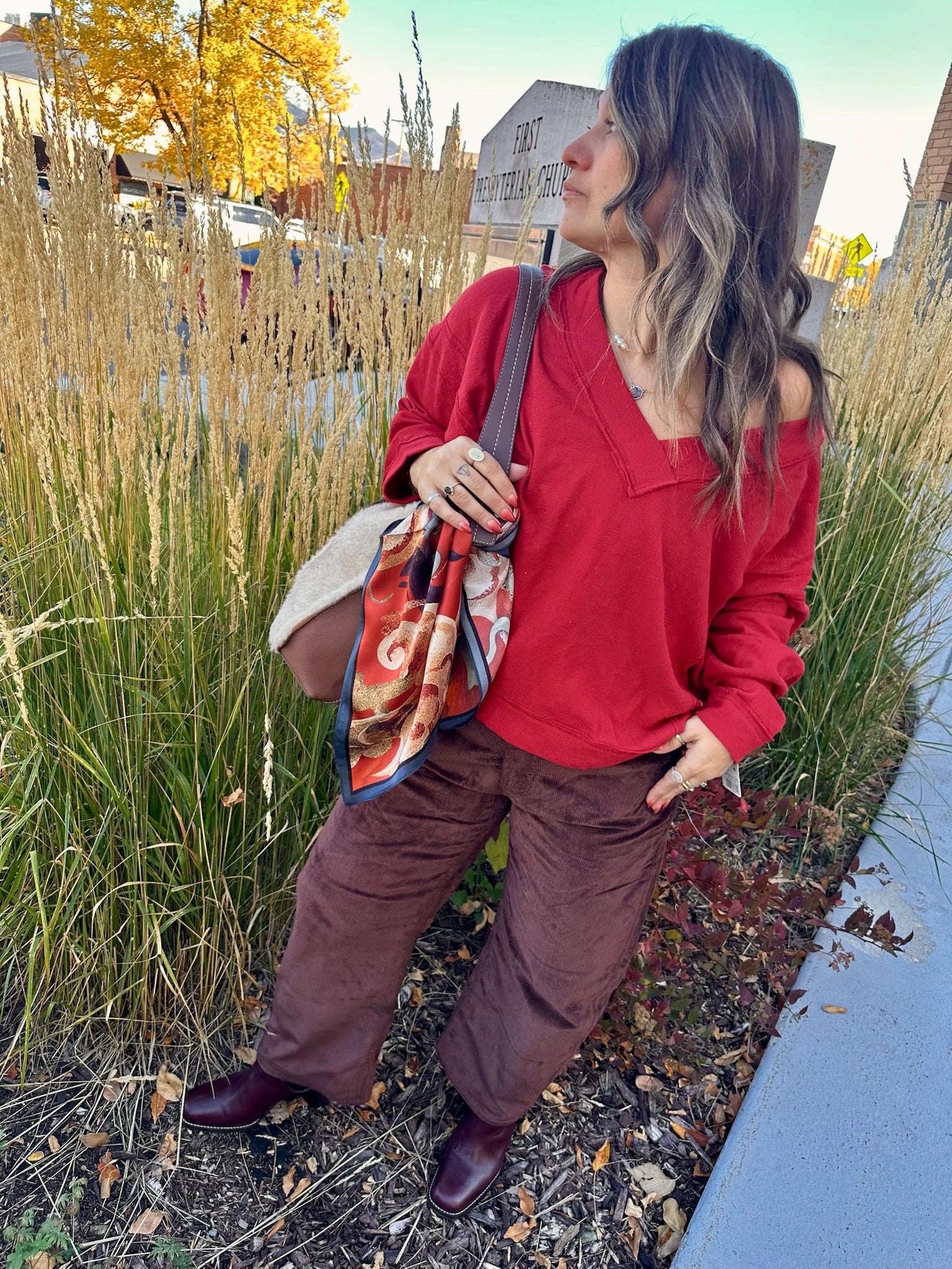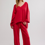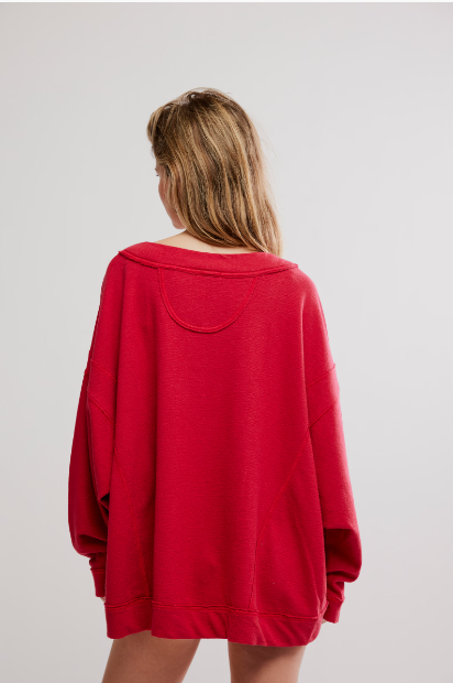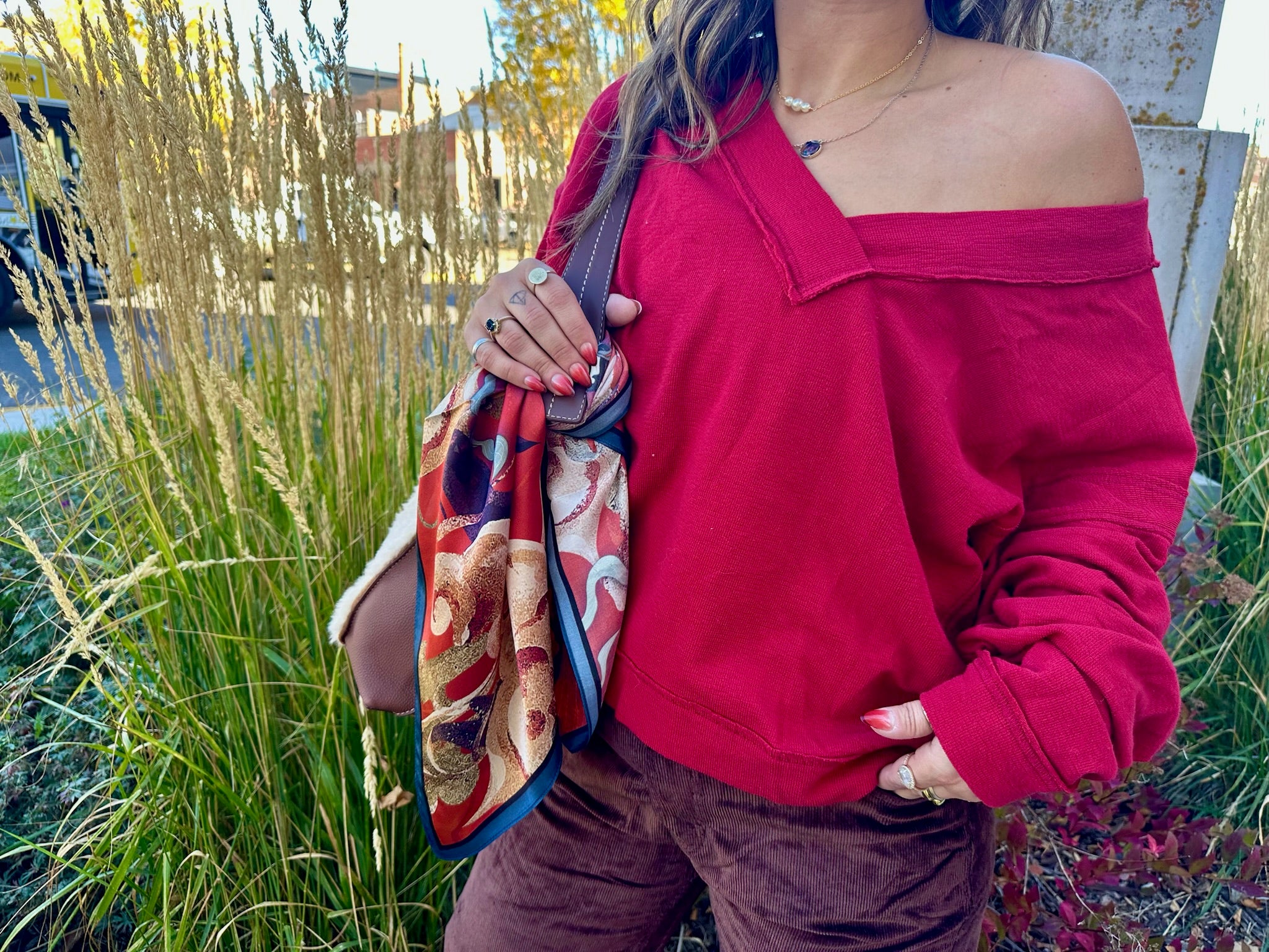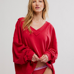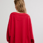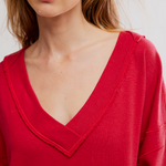 Slouchy, oversized knit with a wide v-neck collar with contrast knit trip, exposed seams, and flowy dolman sleeves make this cozy top a stay-in or go out option. A vivid deep red color makes this perfect top to add some festive feels to any outfit, whether you're cozied up to the fire or out to dinner.