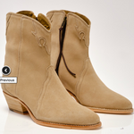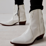 Free People's stand ankle boots in a western-inspired silhouette featuring a low stacked heel and pointed toe. In suede or patent leather.