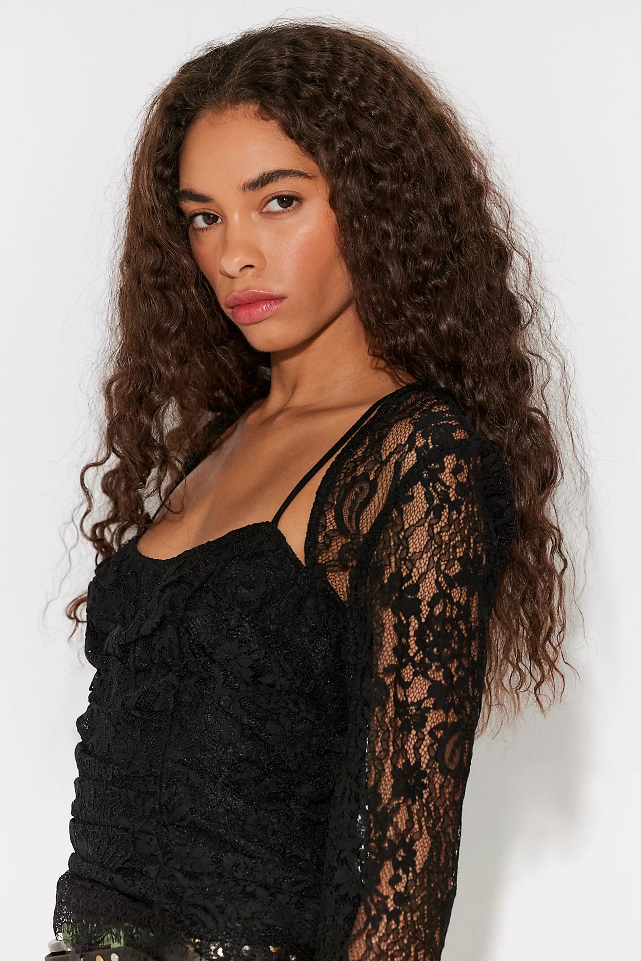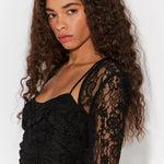 So flirty and flattering, the Paloma is a layered lace tank with spaghetti straps and an attached long-sleeve shrug. The scoop neckline and smocked back bring a retro 90s feel to any outfit.