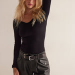 Slip into sleek lines and effortless, comfortable style with this layering top featuring a soft ribbed fabrication, seam detailing, and an ultra-wide, scoop/boat neckline for a design that pairs well under and over your favorite tees and tanks.