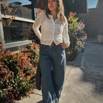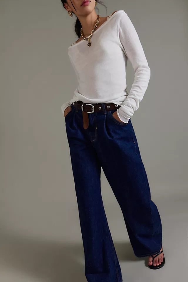 Enjoy a retro-chic look in these sturdy non-stretch denim jeans flaunting a high waist, boldly cuffed wide legs and an adjustable button-tab at the back.