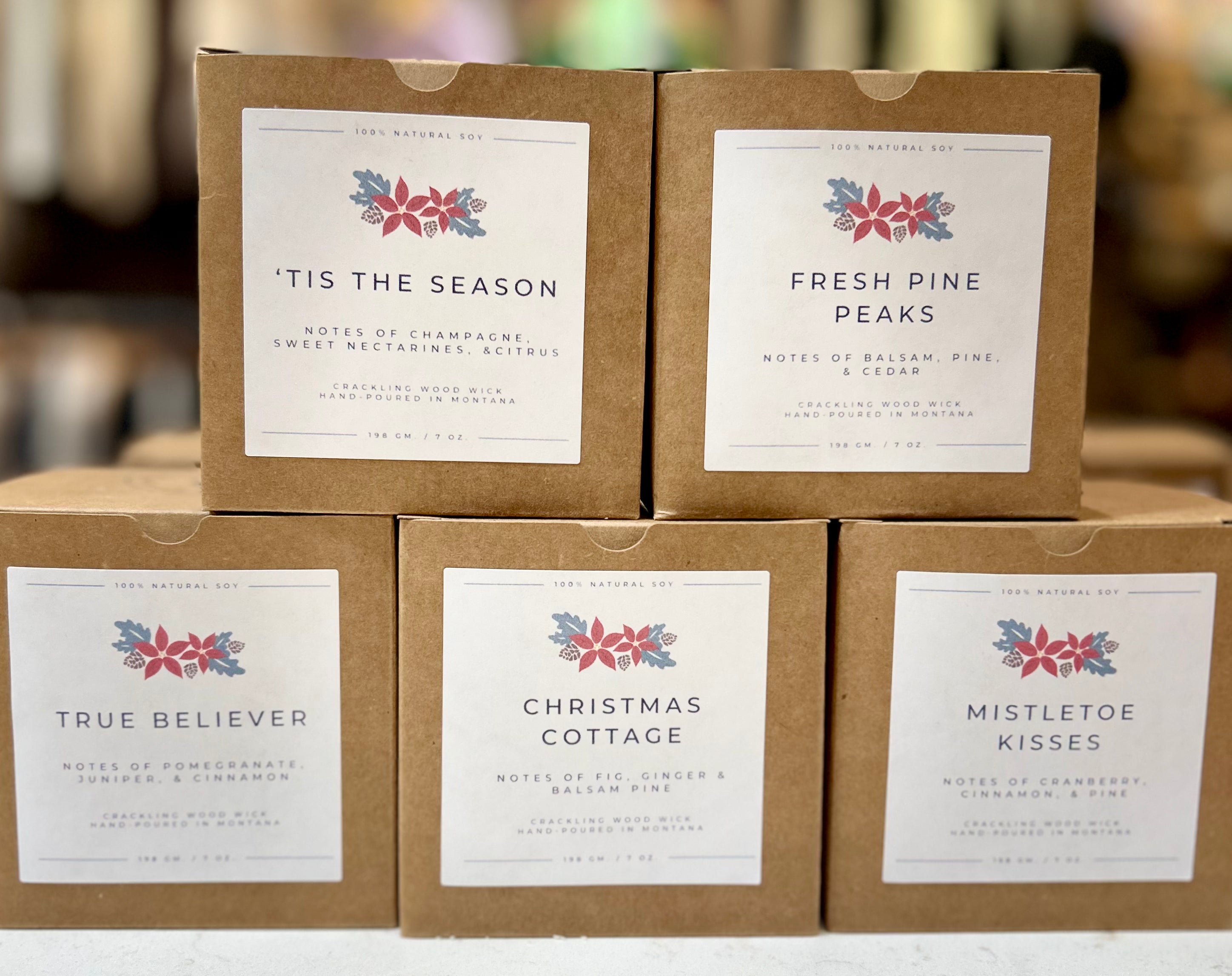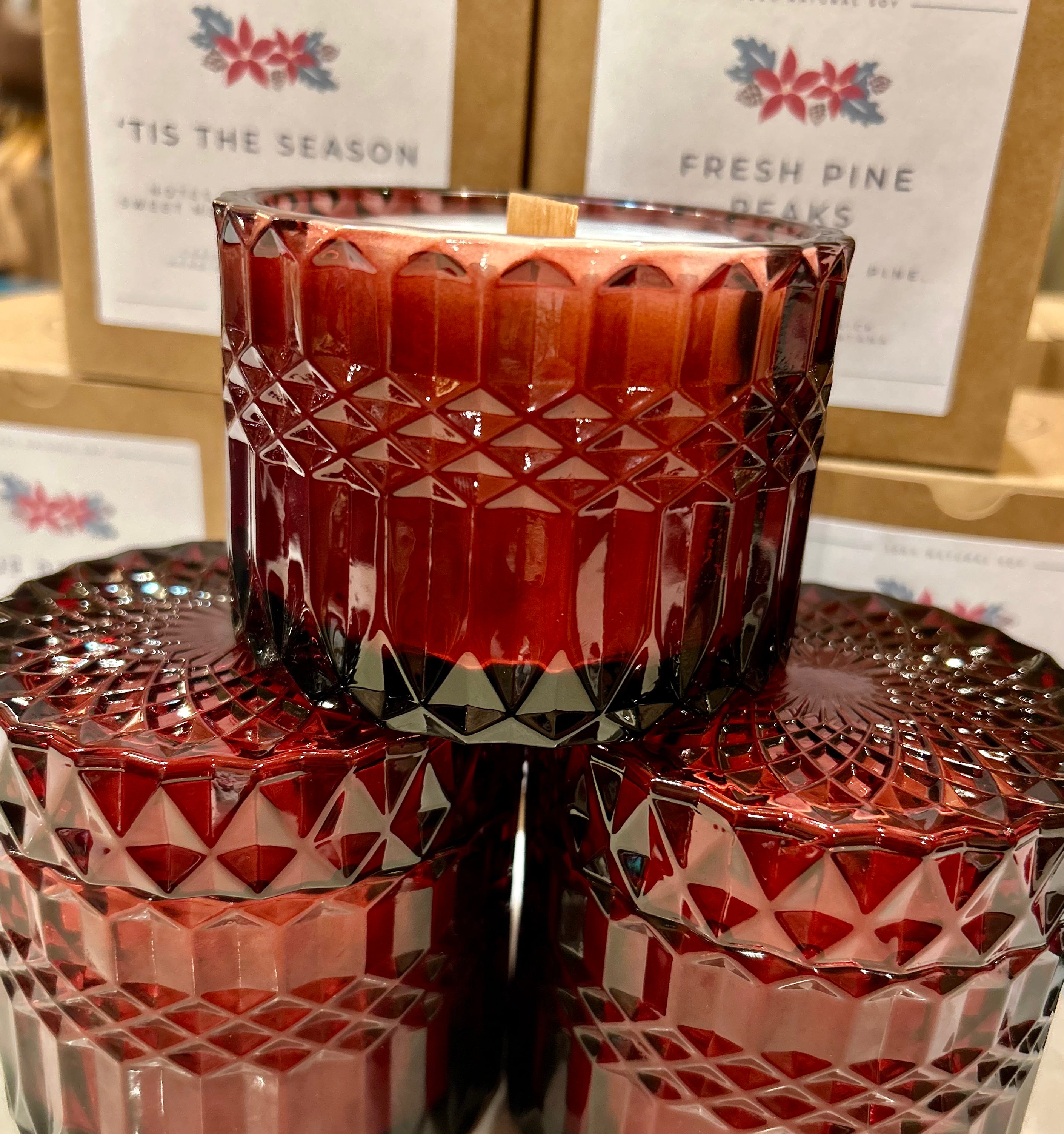 Quintessential Holiday Scents from the Gallatin Candle Company in beautiful burgundy cut glass containers. Five irresistible scents in hand-poured soy candles with wood wick. The perfect gift for yourself, or someone else!