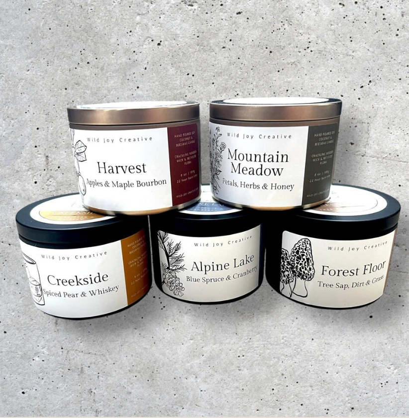 Locally made by amazing artist Kelly Hartman, each Wild Joy Candle contains botanical elements from favorite hikes and ecosystems around Bozeman, MT. Every candle is made with a blend of soy, coconut oil and bees wax finished with a crackling wooden wick.
