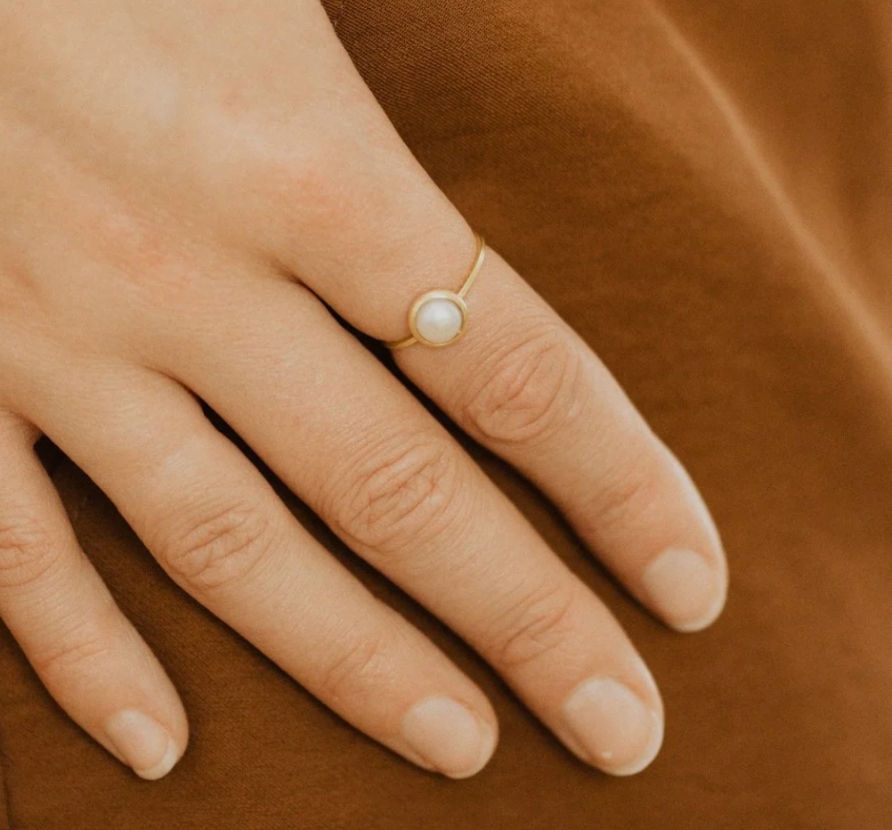 The classic ring; feels like summer vacation in small gold band! A solid brass band with a 6mm bezel set freshwater pearl.