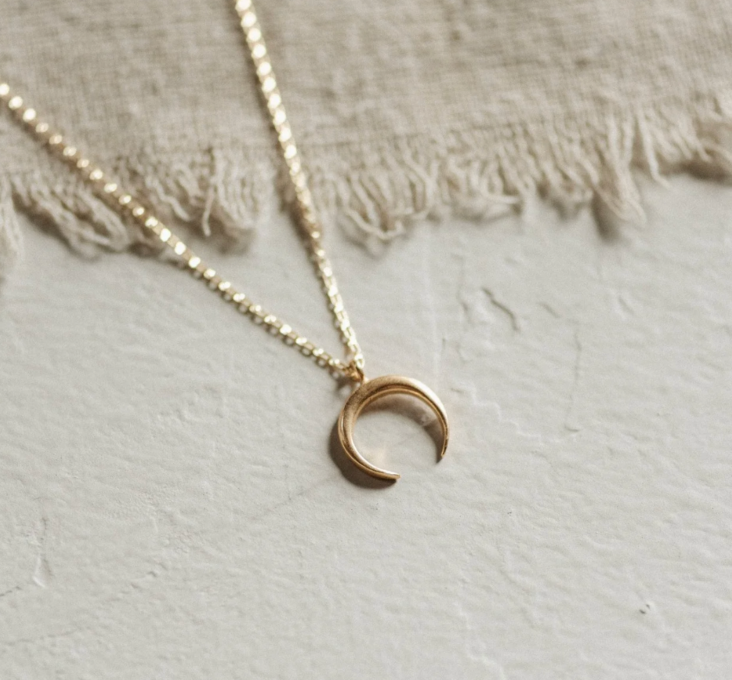 A 24K heavy deposition gold plated 15mm crescent moon shaped piece hangs from an 18" 14K/20 gold filled dainty box-style chain. Pendant: 24K Heavy Deposition Gold Plate