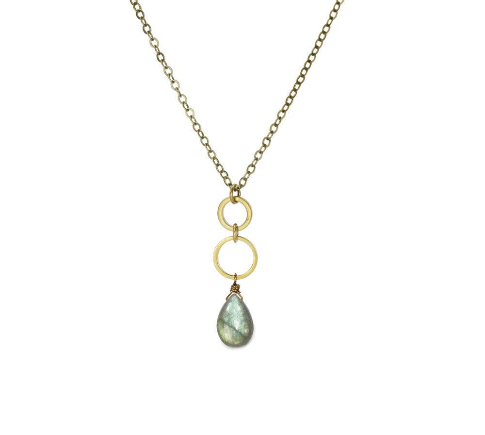 Classic smooth labradorite double vertical circles necklace. The chain length is 16.5"-18". Includes a 1.5" extender which adjusts the chain up to 18". 8x12mm smooth labradorite center stone. Raw brass elements. Minimal & simple design. Made in the USA.