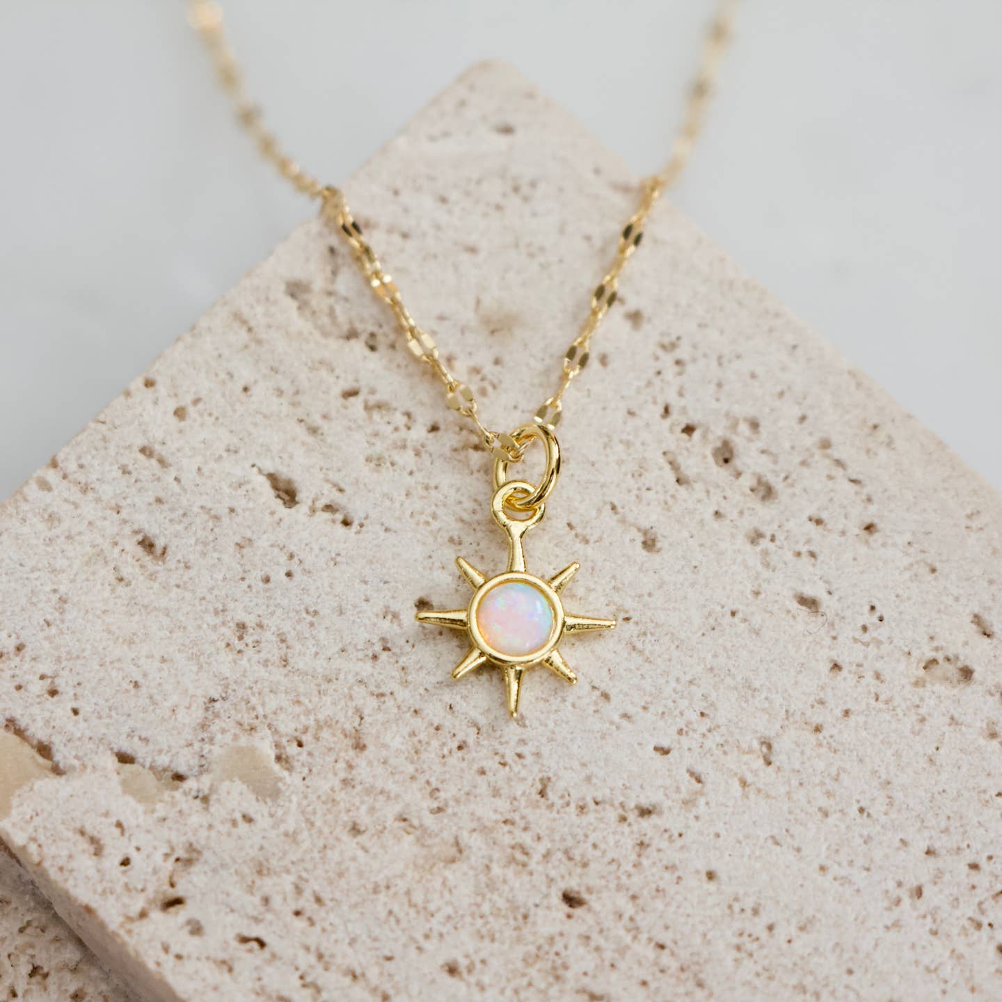 A dainty sun pendant with light opal stone at center on an 18K gold plated chain. Wear it everyday for a bit of positivity and glow.