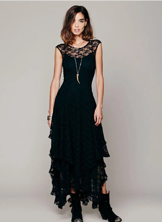 Channel Rhiannon in this ethereal twirling lace slip dress:  Sheer construction, multi-tiered layers, and a floating handkerchief hemline all make this all-over floral lace dress worthy of Ms. Nicks herself.  Grab a tambourine and make the most of this showstopper by going all-in on the 70's vibes, or tame it by wearing it layered with a sweater, slip, and cowboy boots.