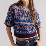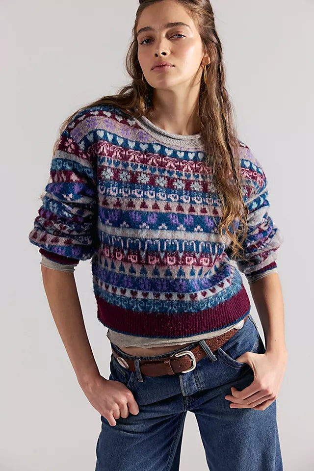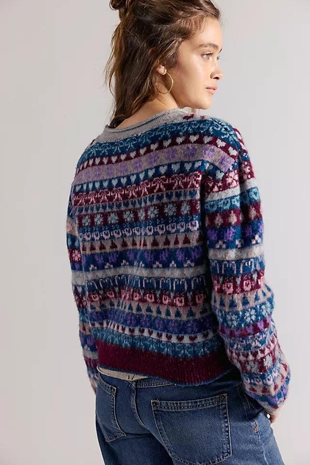 Lines of sweet motifs give this wool-blend sweater the perfect charming look.