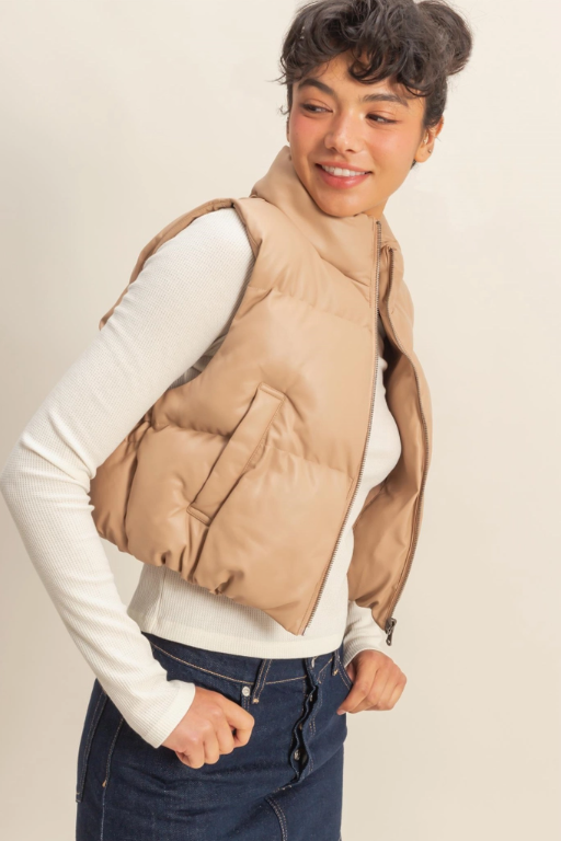 Faux Leather Puffer Vest- Dark Taupe