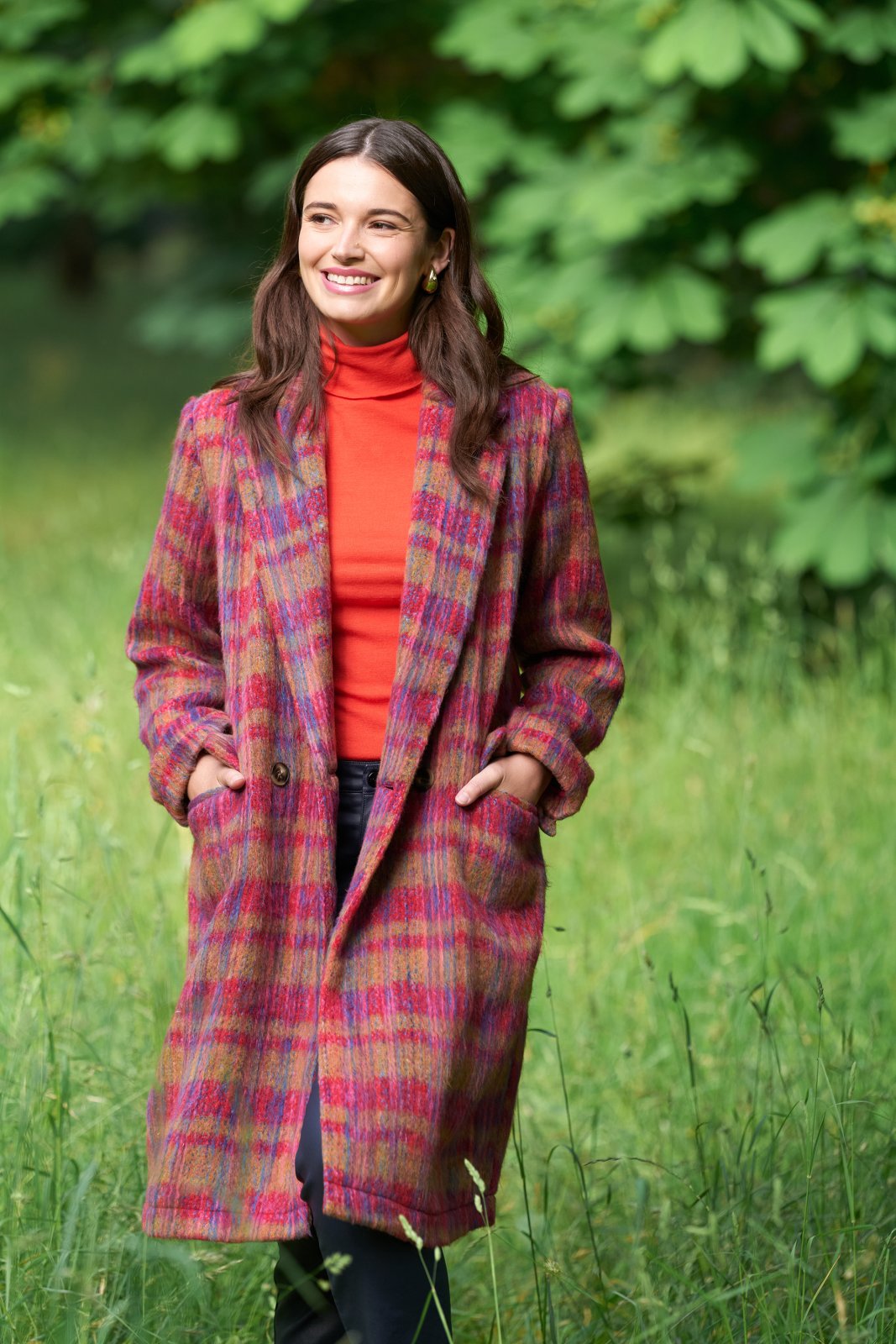 Make a statement in this head-turning fall coat. Double breasted with lapel collar, front flap pockets and long sleeves join all in a soft fuzzy firebird plaid.