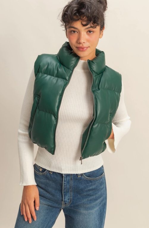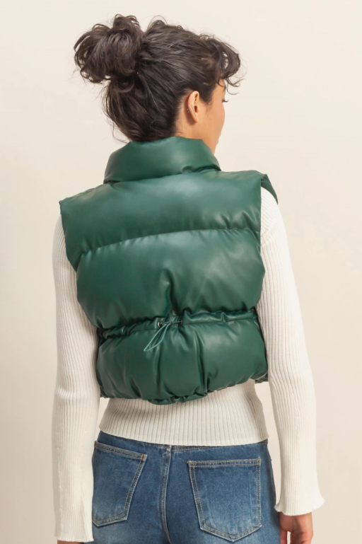 Faux Leather Puffer Vest- Dark Green