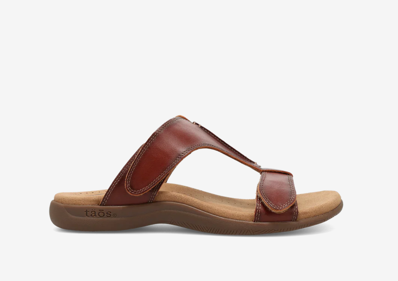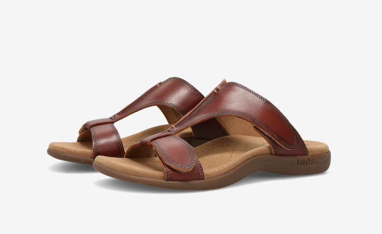 Slide Show is everything you love about Taos's` customer-favorite sandal, The Show, but in a slide version! The premium leather sandals offer a patented shield strap design and two adjustable hook and loop straps for a secure fit. Detailed contrast stitching and seam design accent the upper. Featuring soft Italian leather, these sandals provide a rich look and feel. Soft Cool Recovery Foam® padding and SOFT SUPPORT™ sandal construction provide maximum support and shock absorption. The embossed microfiber footbed is treated with an antimicrobial shield to keep feet cool and dry. The outsoles are flexible, durable rubber.