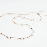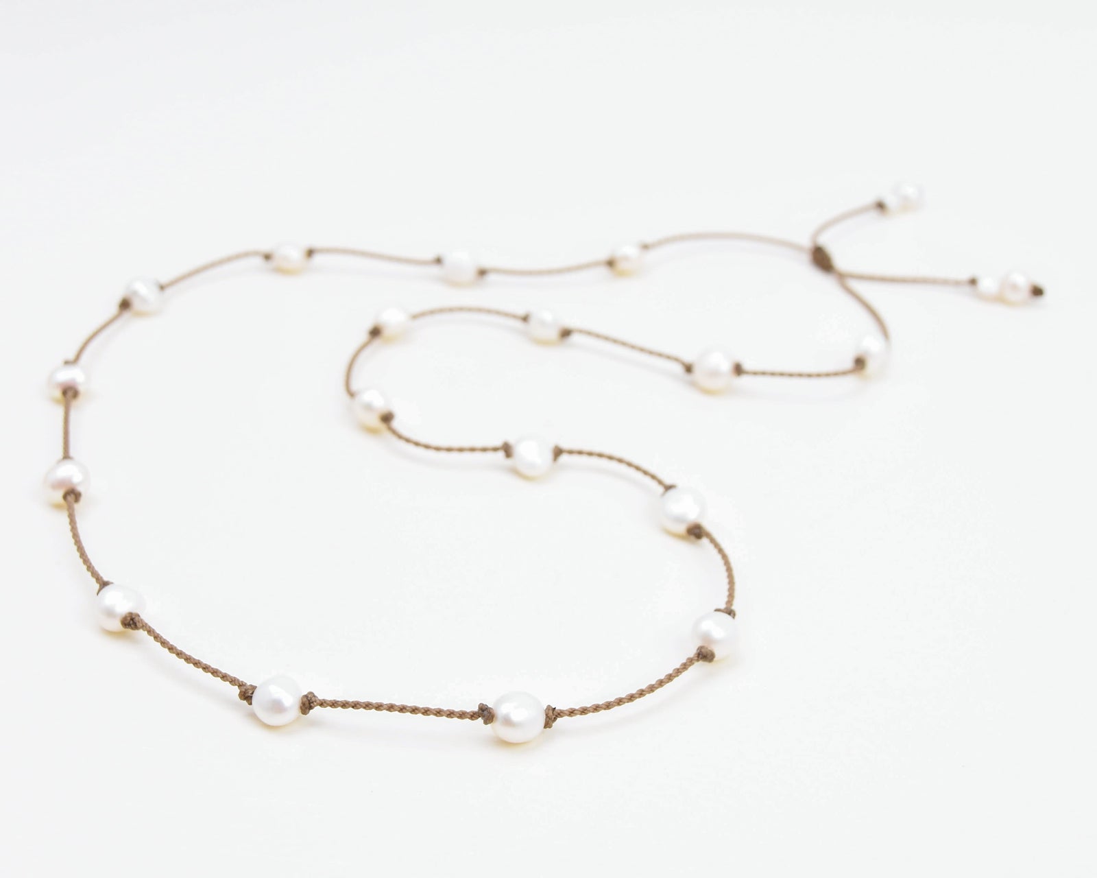 Handmade waterproof rope necklace that doubles as a hatband featuring customizable freshwater pearls (8mm-12mm) with adjustable 22"-28" length and sliding knot closure. Convertible pearl cord jewelry made in USA with hand-spun construction for necklace, choker, or hat styling versatility.
